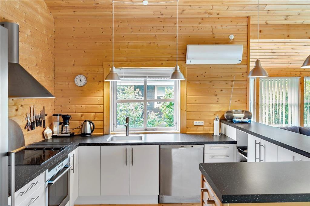 Fra køkken-alrummet af er der udgang til den dejlige træterrasse og haven, som indeholder både havemøbler og grill.