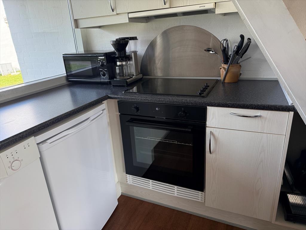 Køkken med ovn, opvaskemaskine, køleskab og emhætte.