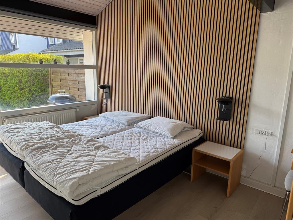 Soveværelse med dobbeltseng, spejl, skabsplads og udgang til terrasse.