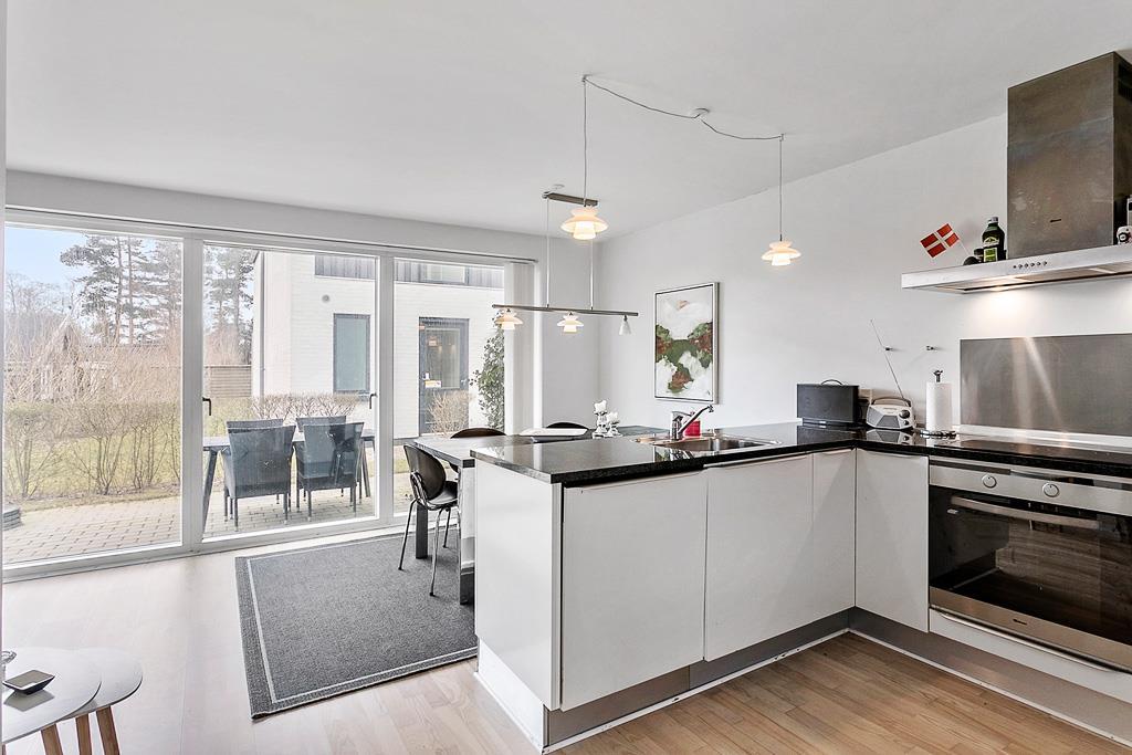 Indrettet med entré med adgang til badeværelse med WC, håndvask og bruseniche, og til et soveværelse med 2 enkeltsenge og god skabsplads. For enden af entréen kommer man ind til husets flotte og lyse køkken-alrum, hvor køkken afdelingen indeholder alt hvad hjertet begærer, mens resten af rummet indeholder et spisebord med stole og en sovesofa. Fra køkken-alrummet er der også udgang til boligens dejlige terrasse.
