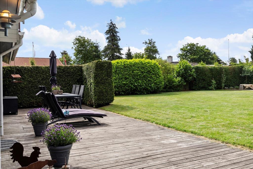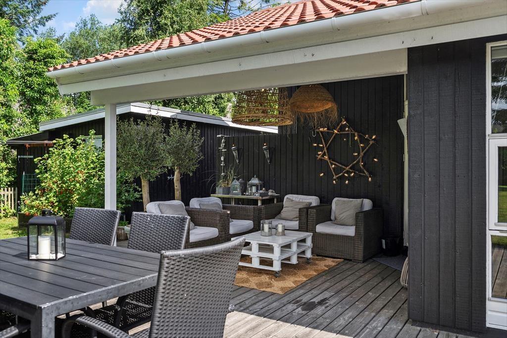 Udenfor kan I virkelig nyde livet. Her er en skøn, stor træterrasse med spiseplads til 12 personer – perfekt til alt fra morgenmad i solen til lange aftener med vin og gode grin under stjernerne. Som prikken over i’et har terrassen også en hyggelig loungeafdeling under husets tag, hvor I kan trække jer tilbage og slappe af i skyggen eller sidde tørt og godt, selv hvis sommervejret skulle drille.