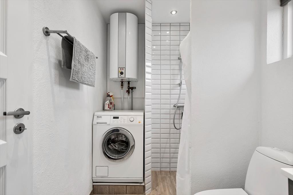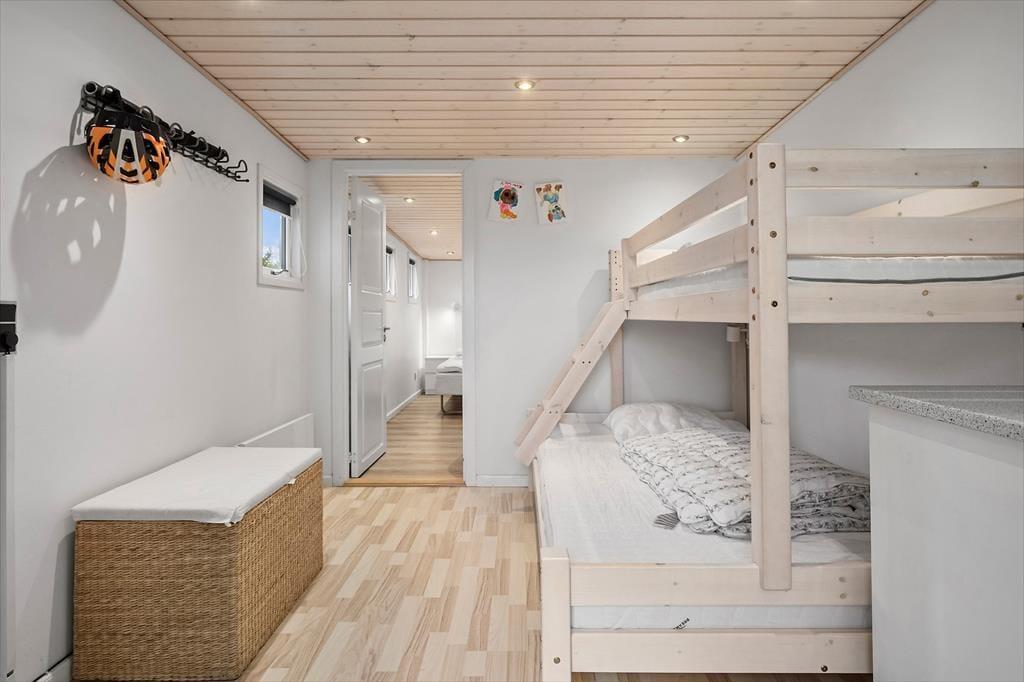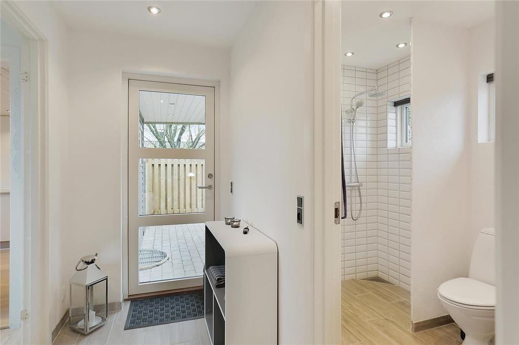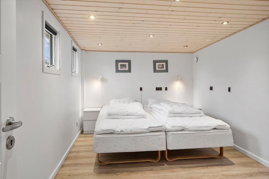Boligen er indrettet med indgang til en lille entré/gang, med plads til sko og jakker og hvorfra der også er adgang til det flotte flisebadeværelse, samt husets ene soveafdeling, hvor der er en dobbeltseng og en sovesofa.
