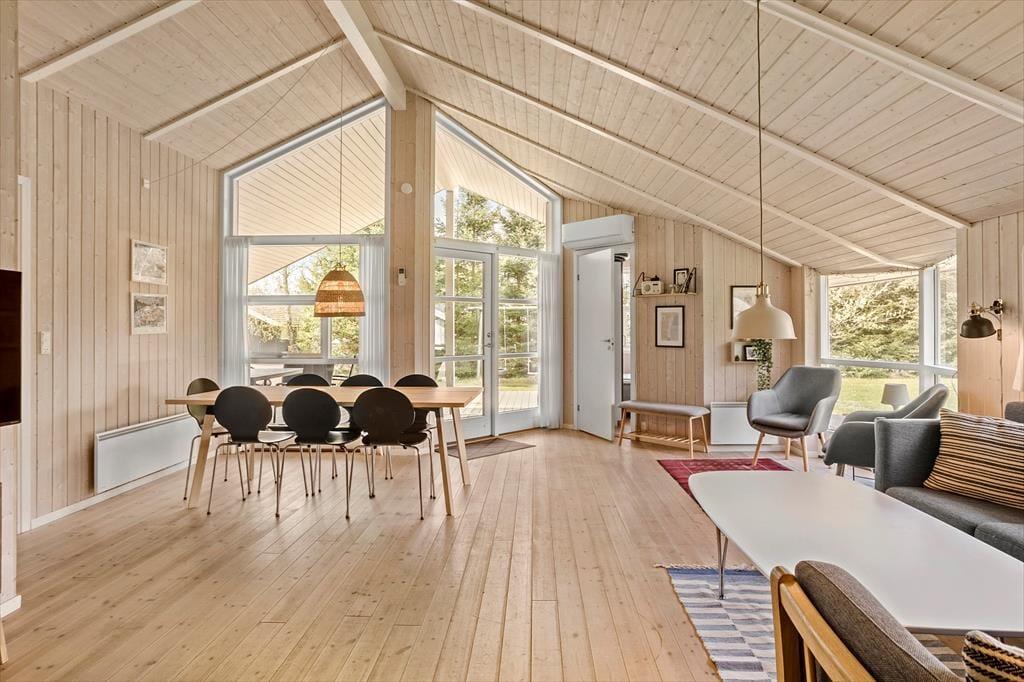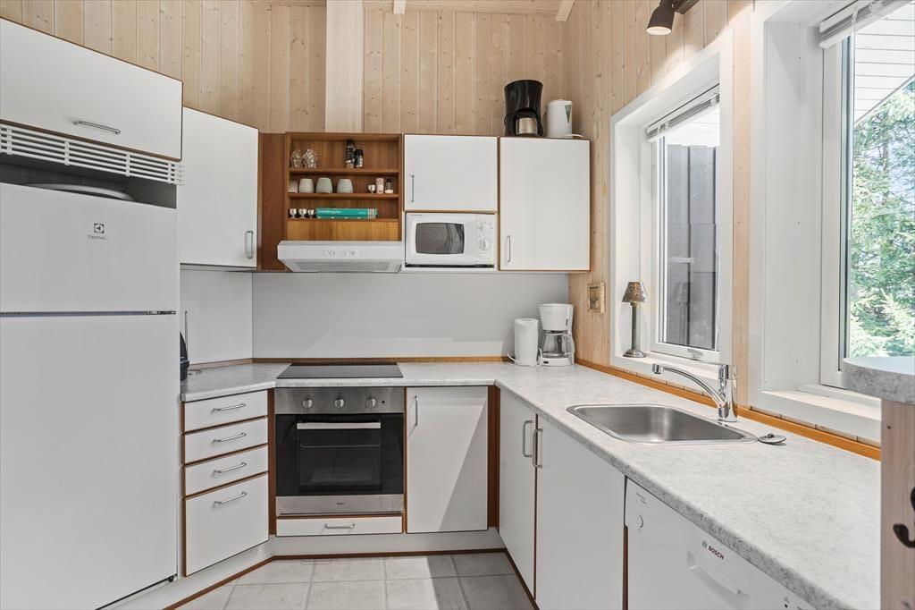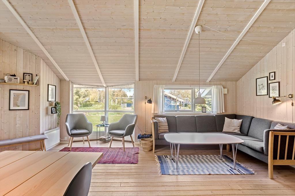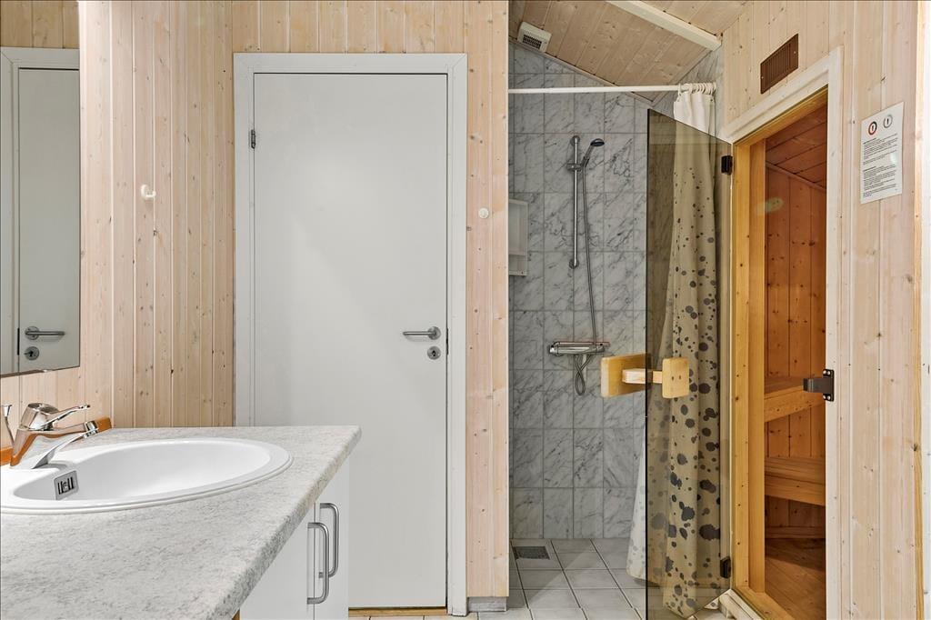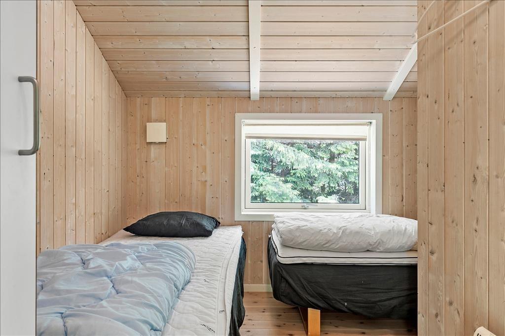 Fritidshuset byder på 4 værelser: 2 store værelser med dobbeltsenge og 2 mindre værelser på ca. 6 kvm. med 2 enkeltsenge på hver, 1 stort badeværelse med spa, sauna, wc og bruser, samt et lille badeværelse kun med wc, åbent køkken indtil stuen hvor der er spiseområde, sofaarrangement og udgang til en delvist overdækket terrasse. Velegnet til 4 voksne og 4 børn.