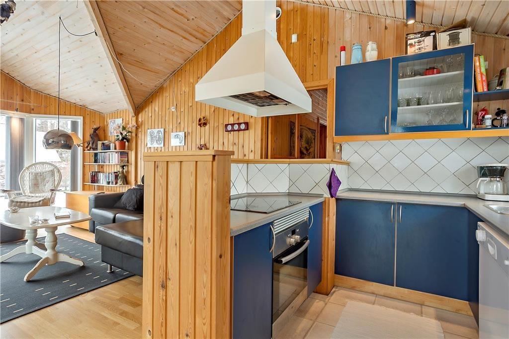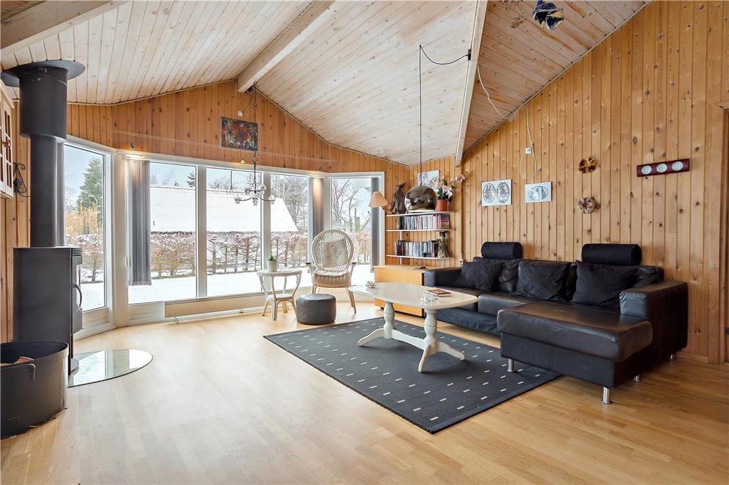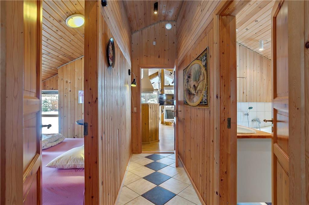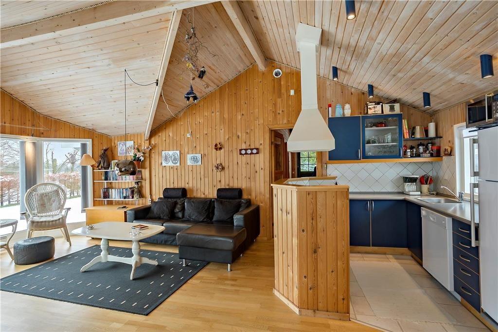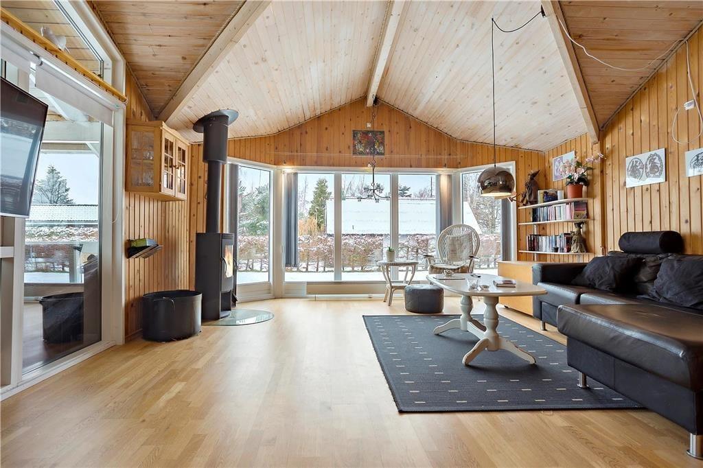 Feriehuset indeholder: Entre/gang, 3 gode soveværelser, 1 badeværelse med WC, bruser, vaskemaskine og sauna, åbent køkken som har opvaskemaskine, køleskab med fryser, ovn, komfur, kaffemaskine osv. Endvidere byder sommerhuset på en stor og dejlig stue, hvor der er spiseområde, sofa arrangement ved brændeovnen og en alkove.