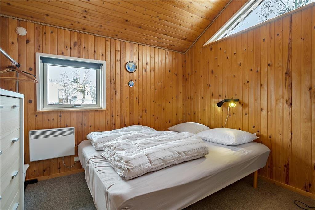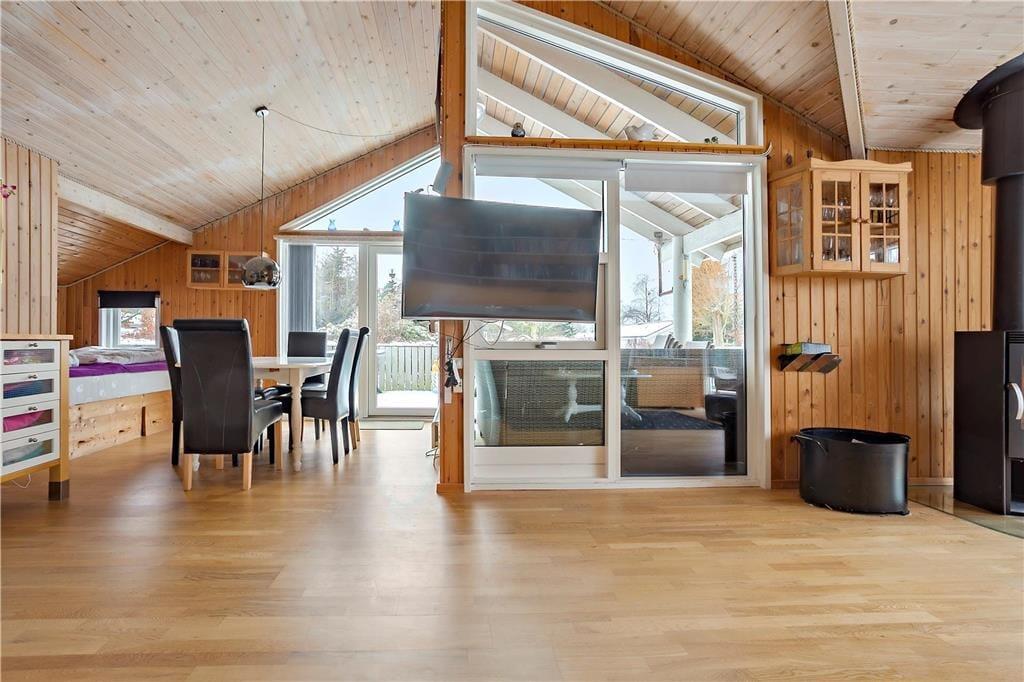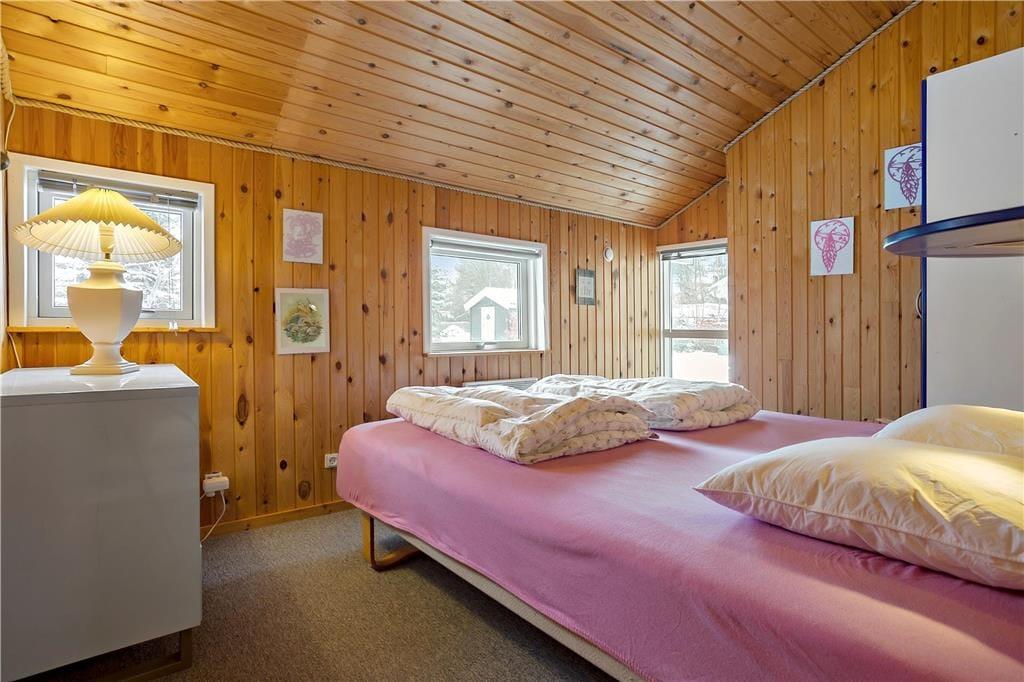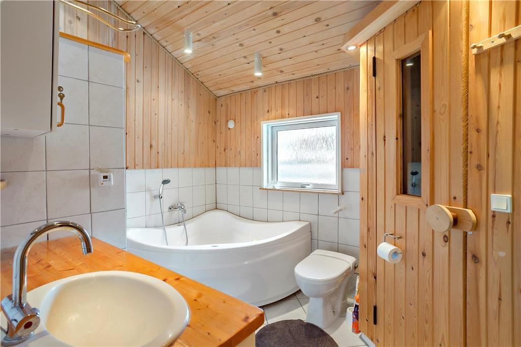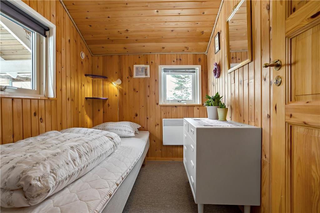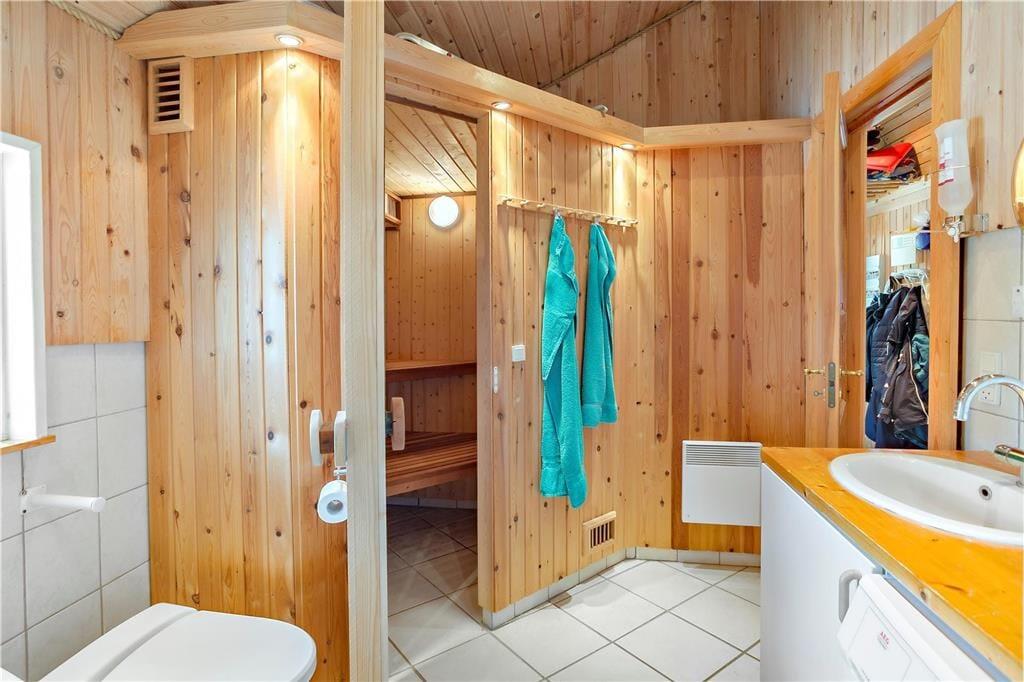 Feriehuset indeholder: Entre/gang, 3 gode soveværelser, 1 badeværelse med WC, bruser, vaskemaskine og sauna, åbent køkken som har opvaskemaskine, køleskab med fryser, ovn, komfur, kaffemaskine osv. Endvidere byder sommerhuset på en stor og dejlig stue, hvor der er spiseområde, sofa arrangement ved brændeovnen og en alkove.
