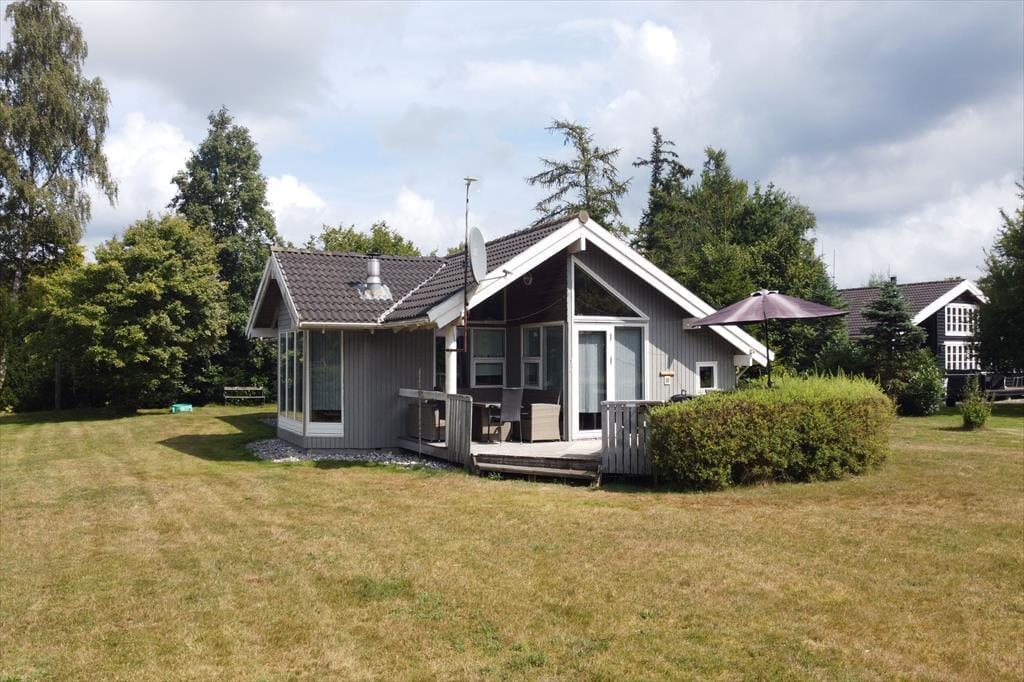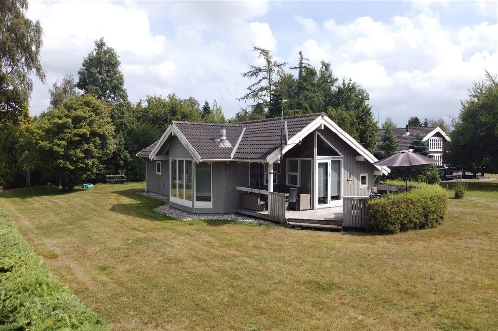 Fritidshuset er beliggende på en 1215 m2 stor grund med masser af plads til diverse aktiviteter på græsplænen. Derudover har fritidshuset en stor og skøn terrasse som er delvist overdækket, terrassen indbyder til hyggelige stunder med familie eller venner.