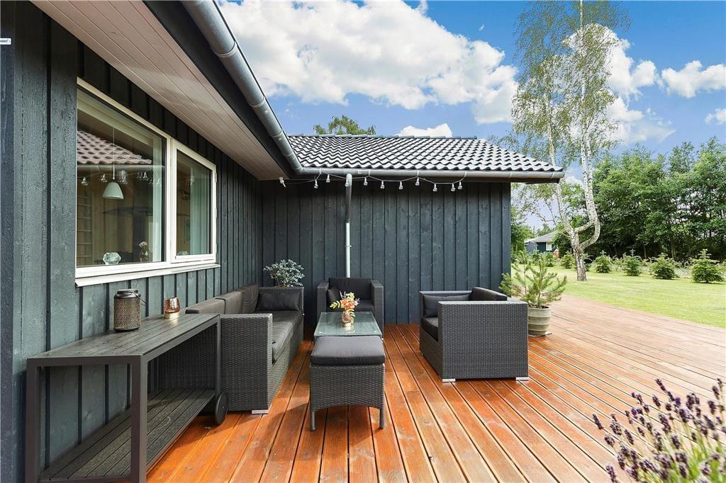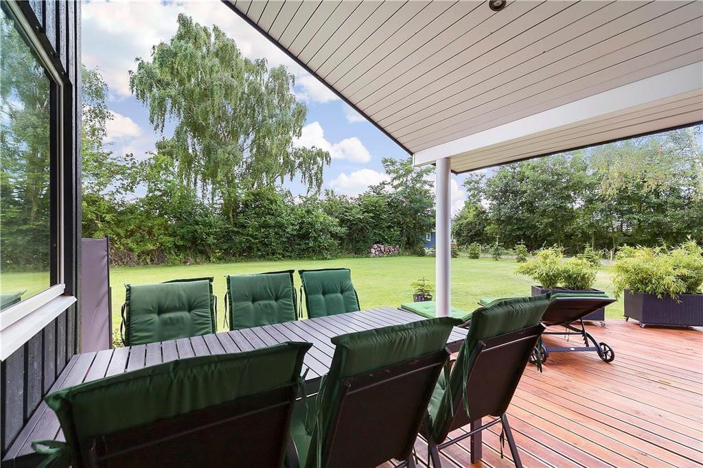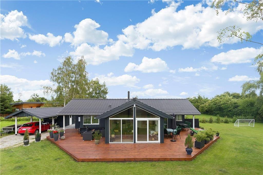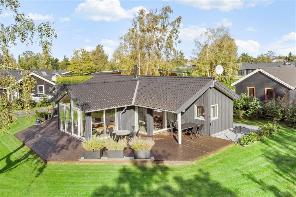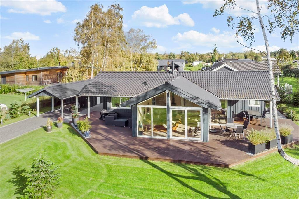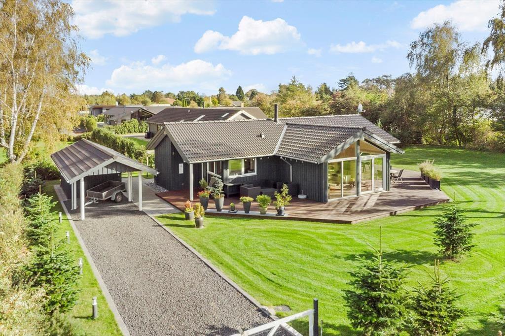 Fritidshuset er beliggende på en 1239 m2 stor lukket grund med masser af plads til diverse aktiviteter på græsplænen. Derudover har fritidshuset en stor og skøn terrasse som er delvist overdækket, terrassen indbyder til hyggelige stunder med familie eller venner. Samt en carport til bilen.