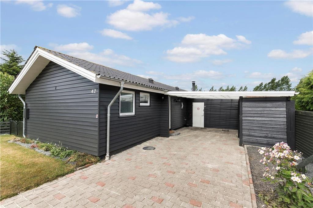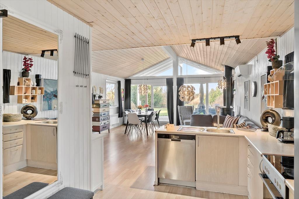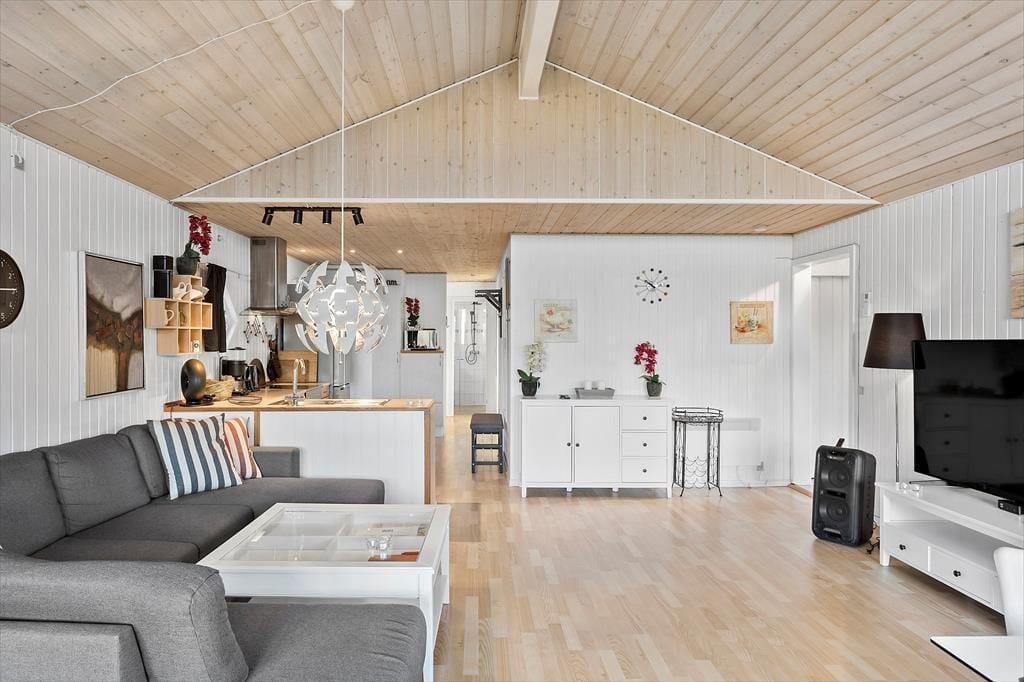 Huset tilbyder en lille entré, et pænt klinkebadeværelse med brusekabine og WC og et lille ”badeværelse” med håndvask og vaskemaskine. Derudover indeholder huset 4 gode soveværelser med plads til 8 personer, et flot åbent køkken og en dejlig opholdsstue med sofa, spisebord og udgang til terrasse.