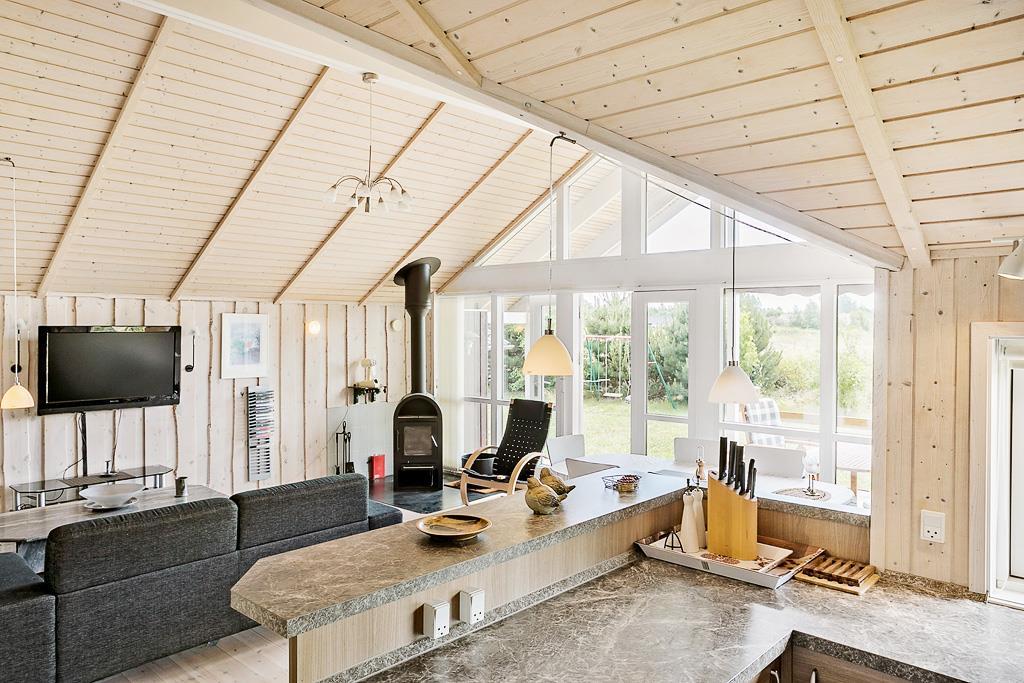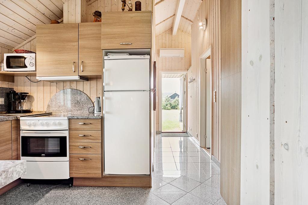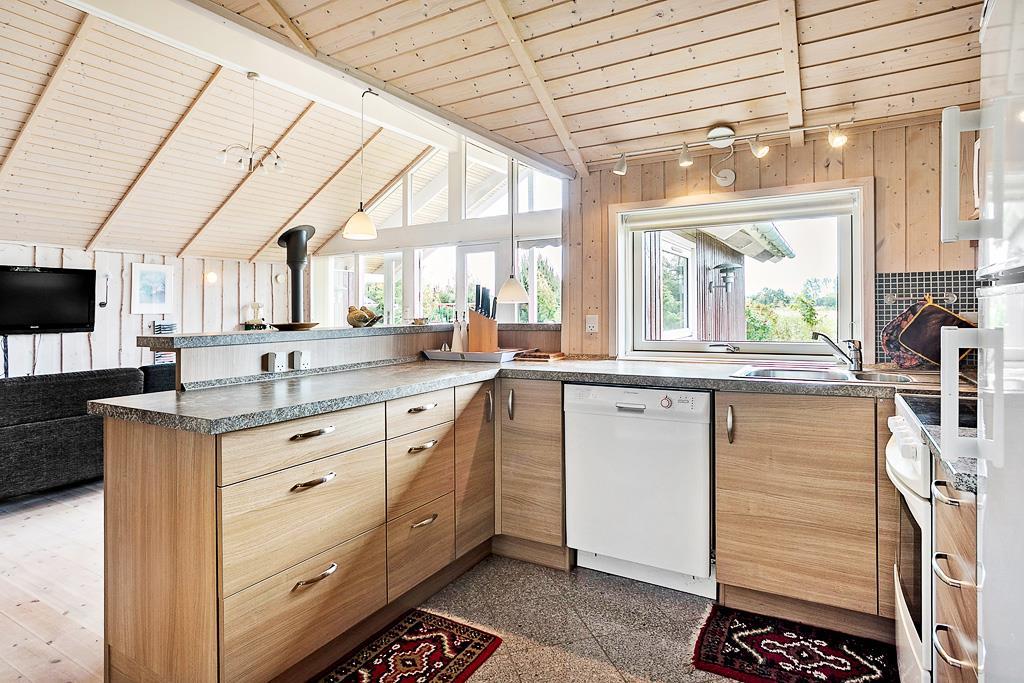 Køkkenet som er lavet med flotte trælåger og en flot stenbordplade, ligger i flot åben forbindelse med stuen, kun opdelt af en bardisk. Køkkenet indeholder både køleskab og opvaskemaskine og alt andet som man ellers skulle få brug for på ferien.