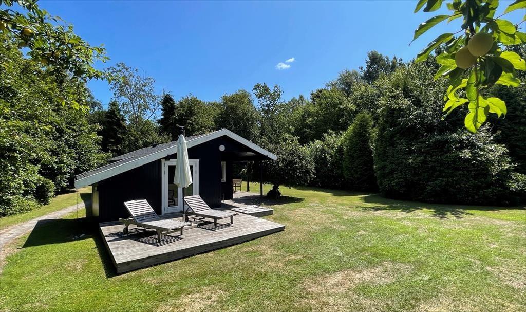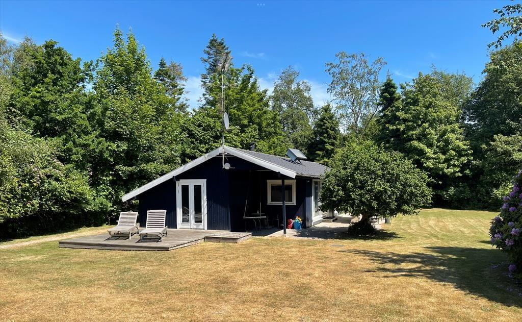 Godt indrettet fritidshus med indgang til en lille entré, hvorfra der er adgang til badeværelset samt det ene soveværelse. Videre gang fra entréen og ind i køkkenet, som indeholder alt hvad der til ferien behøves. I stuen står der et spisebord nær køkkenet, mens der i den anden ende af stuen både er blevet plads til lænestole, sofa, tv og en brændeovn. Fra stuen er der videre gang til husets 2 soveværelse, samt udgang til den dejlige overdækkede terrasse og haven.