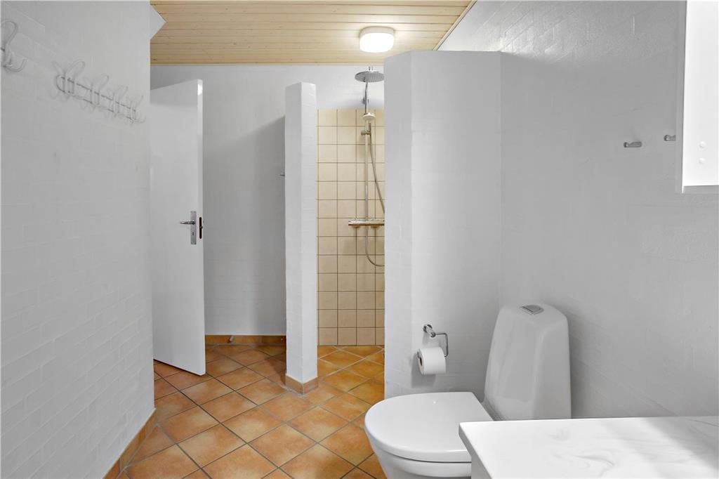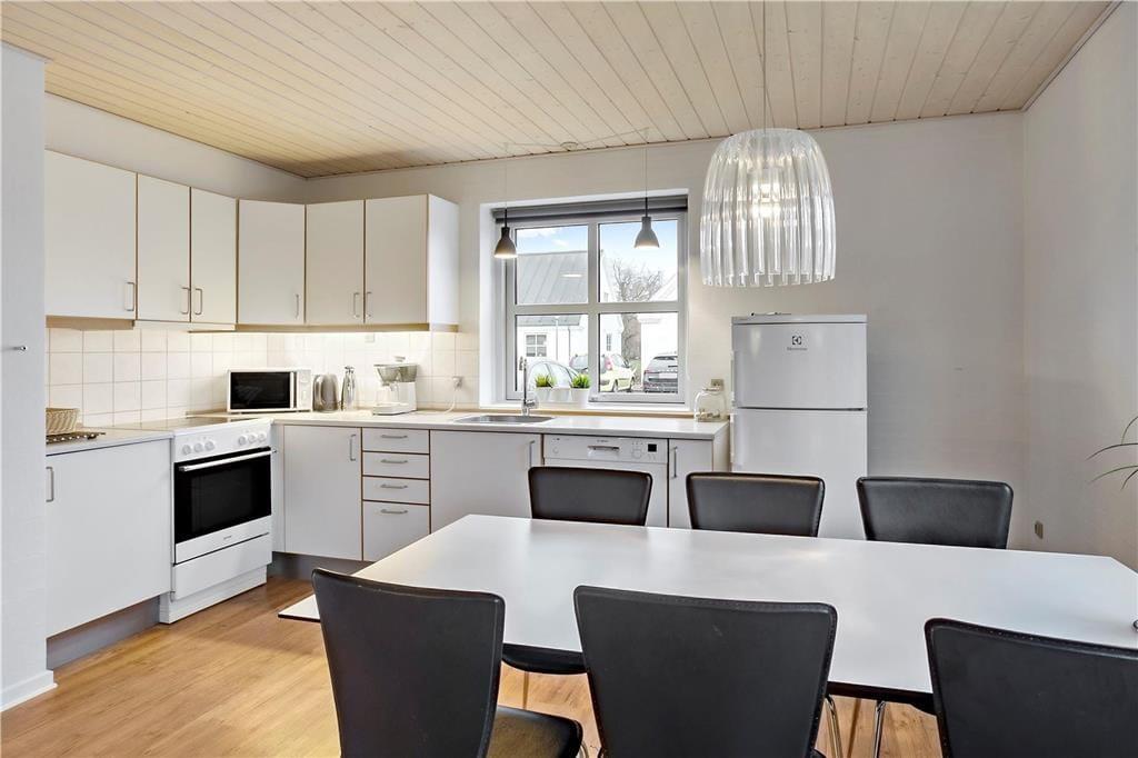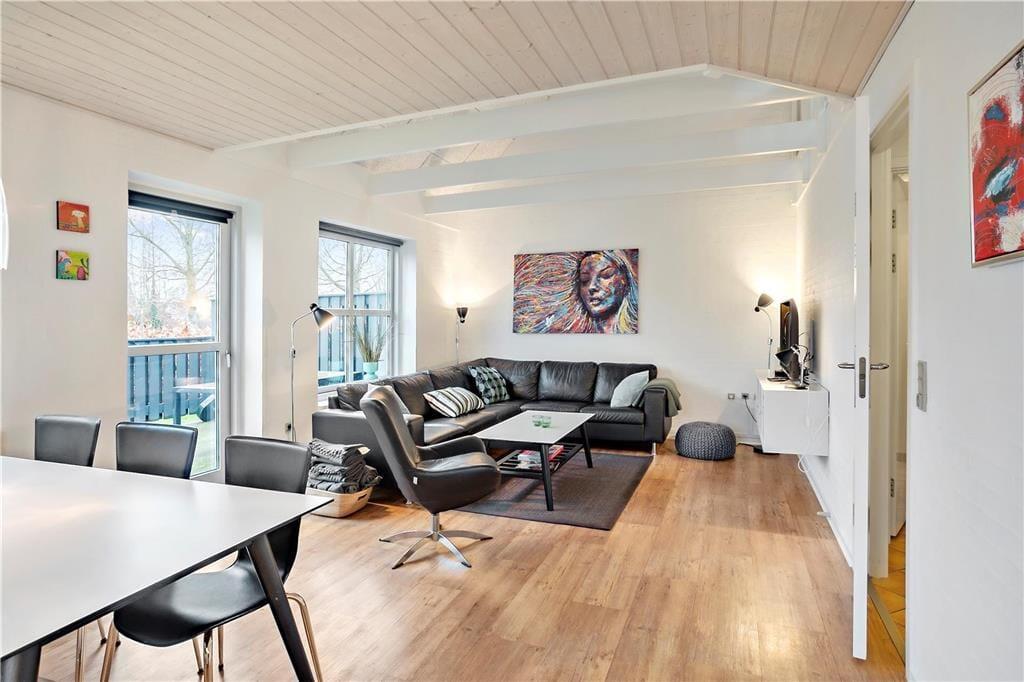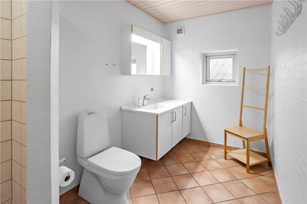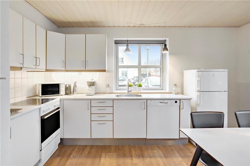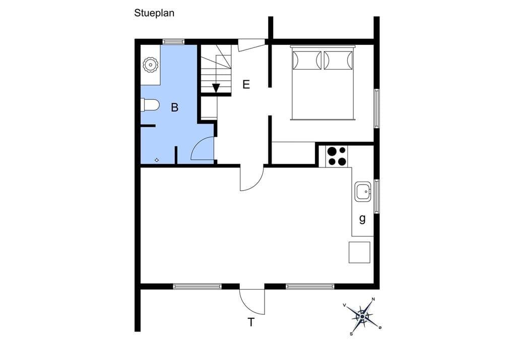 Stueplan: Entré med trappe til førstesal. Badeværelse med WC og bad. Soveværelse med dobbeltseng. Åbent køkken med køleskab, opvaskemaskine, spisebordsafdeling og alt hvad hjertet ellers begærer. I den anden ende af køkken-alrummet finder man husets stue, som tilbyder en dejlig sofa- og tv-afdeling. Udgang til 10 m² åben terrasse med havemøbler og grill.