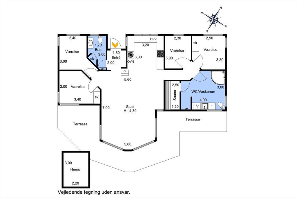 Fritidshuset indeholder: Entre, gæstetoilet, 4 rigtig gode soveværelser, badeværelse med wc, bruser, spa og sauna, køkken-alrum med spiseafdelingen tæt på, stue med sofaområde og udgang til terrassen.
