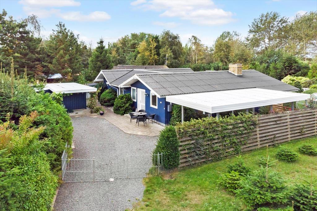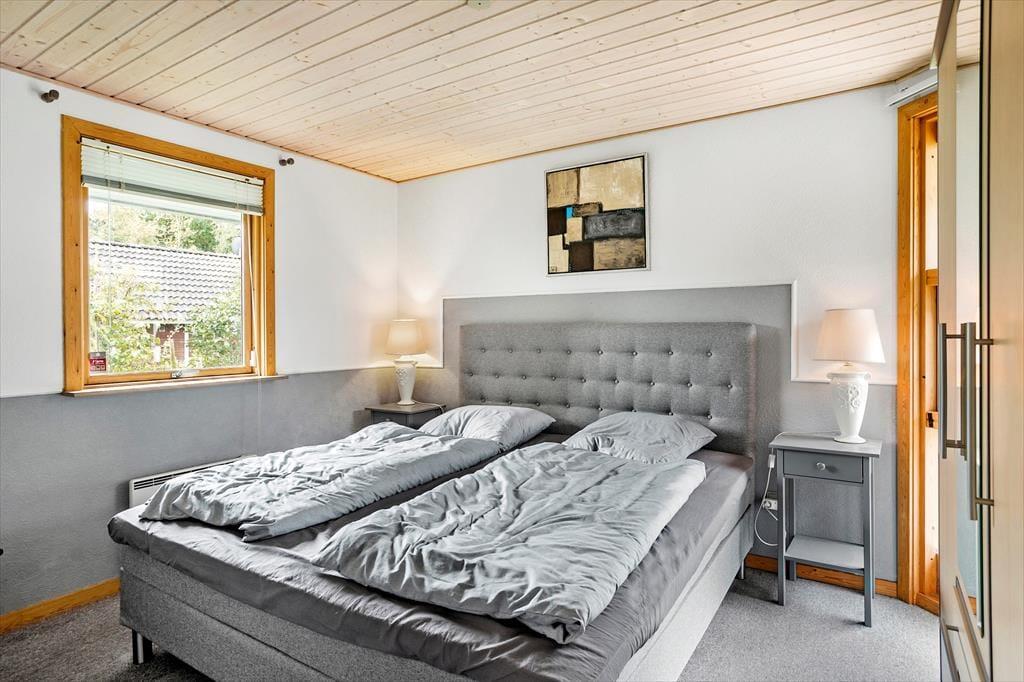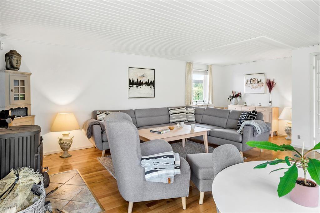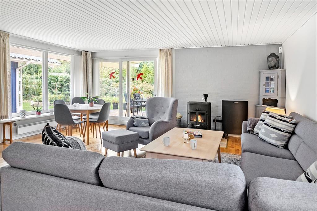 Fritidshuset indeholder: Entré, 1 stort badeværelse, samt 1 gæstetoilet med wc, vaskemaskine og tørretumbler, 3 gode soveværelser, dejligt køkken i åben forbindelse til den store stue med brændeovn, varmepumpe, spiseafdeling, sofaområde og udgang til den skønne terrasse som er delvist overdækket.
