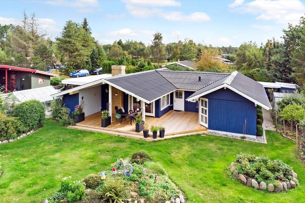 Fritidshuset er beliggende på en 1006 kvm stor grund med en flot have, der er meget pæn anlagt med græs, pæne træer og god randbeplantning, her er sol fra morgen til aften.