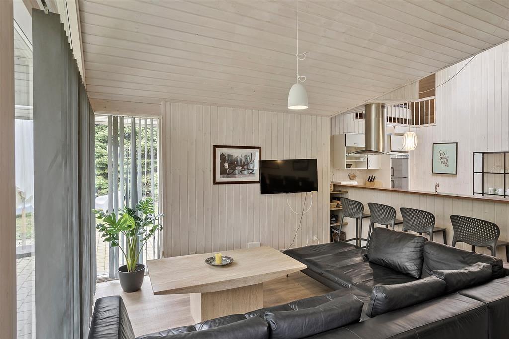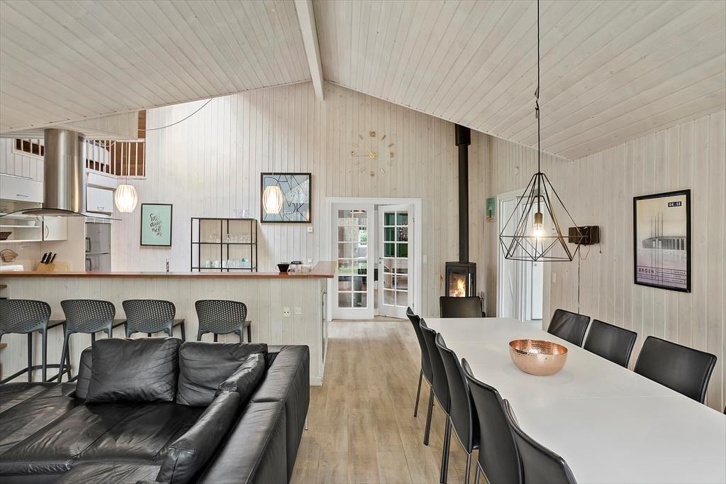 Fra køkkenet kommer du ind i en dejlig stue med brændeovn, med masser af siddepladser og rig mulighed for afslapning foran tv´et om aftenen efter alle dagens aktiviteter.