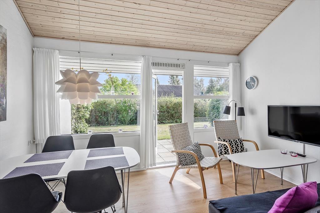 Stue med henholdsvis spiseafdeling og sofa afdeling med tv.