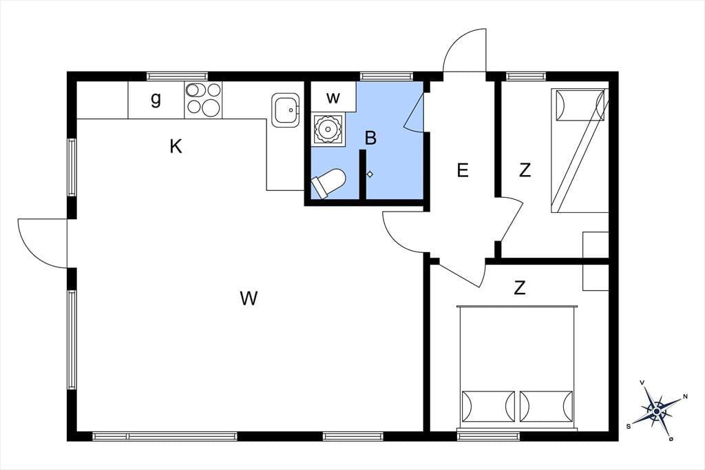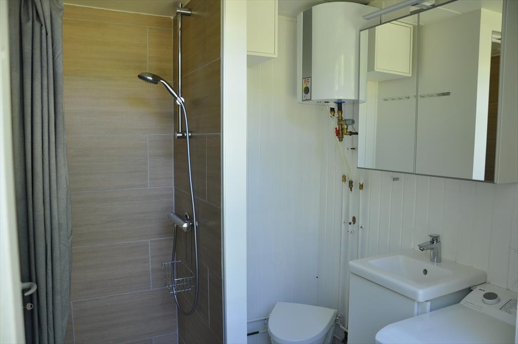 Når du træder ind i huset, mødes du af en rummelig entré med god plads til sko og jakker. Herfra er der adgang til det nyrenoverede badeværelse, som er udstyret med wc, brusekabine, vaskemaskine og håndvask.