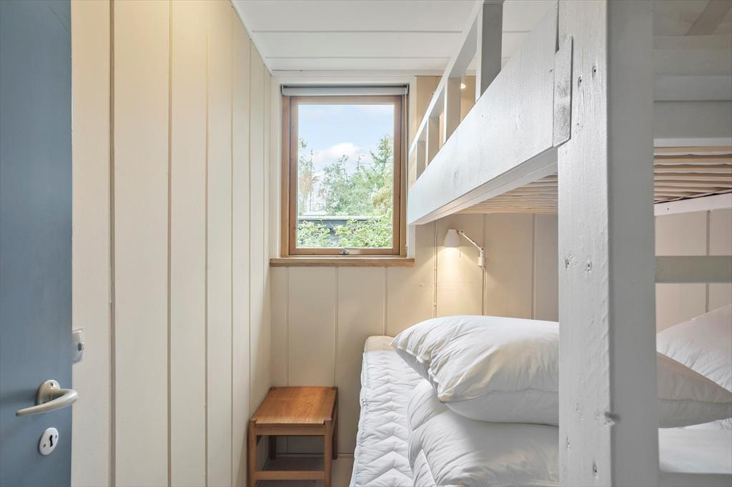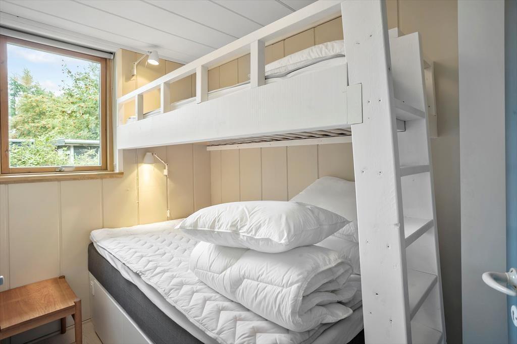 Huset har to soveværelser. Det ene soveværelse er indrettet med to komfortable elevationssenge (90x200 cm), garderobeskab, tv med Chromecast og opladerstik ved sengen. Det andet soveværelse har en køjeseng, hvor overkøjen måler 90x200 cm og underkøjen 120x200 cm.