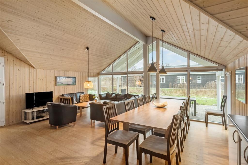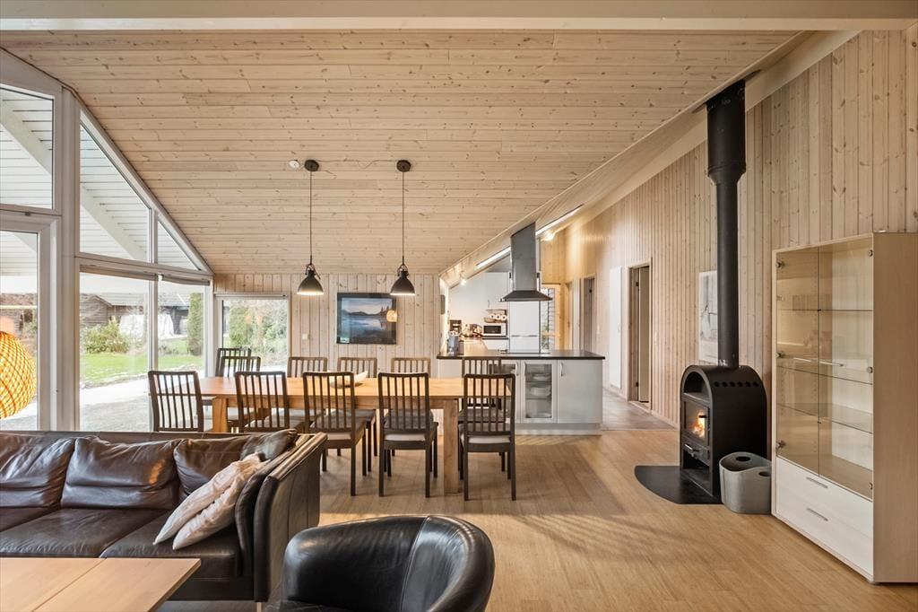 Fra køkkenet kommer du ind i en dejlig stue med brændeovn, med masser af siddepladser og rig mulighed for afslapning foran tv´et om aftenen efter alle dagens aktiviteter.
