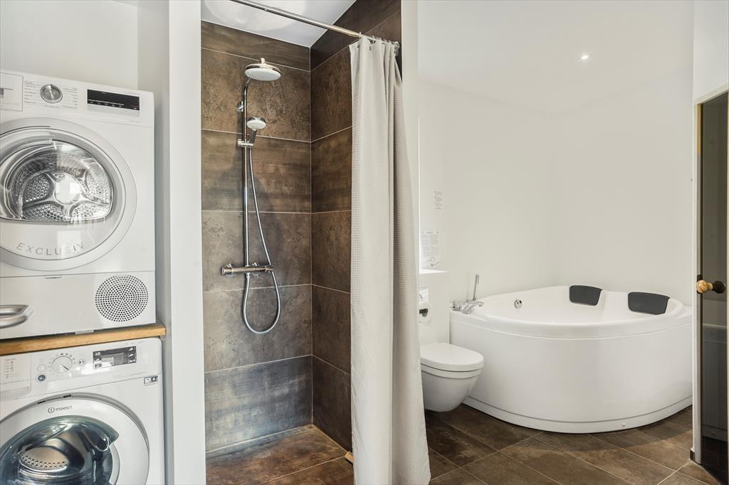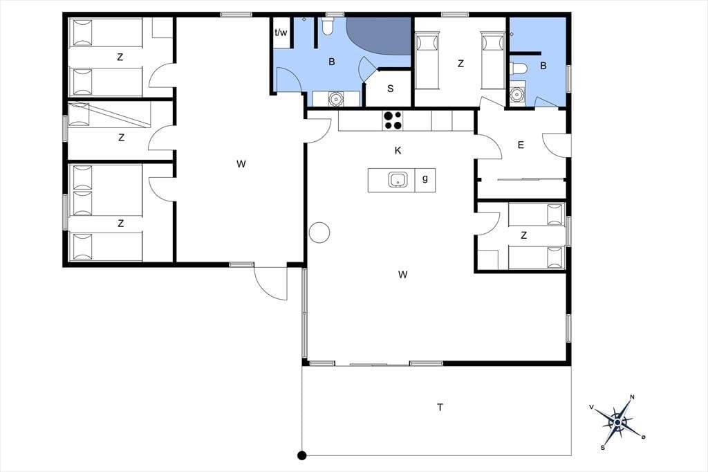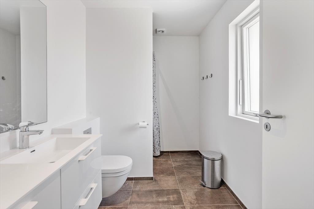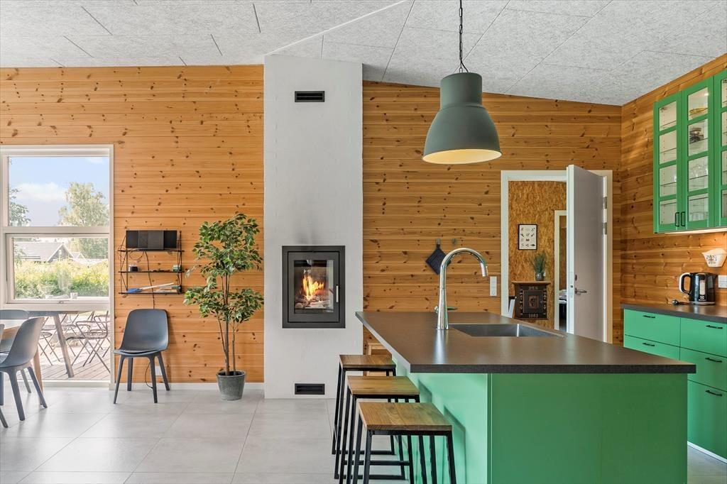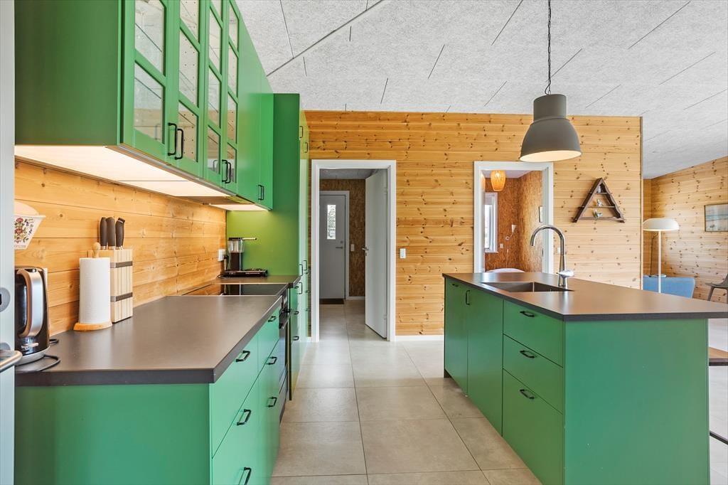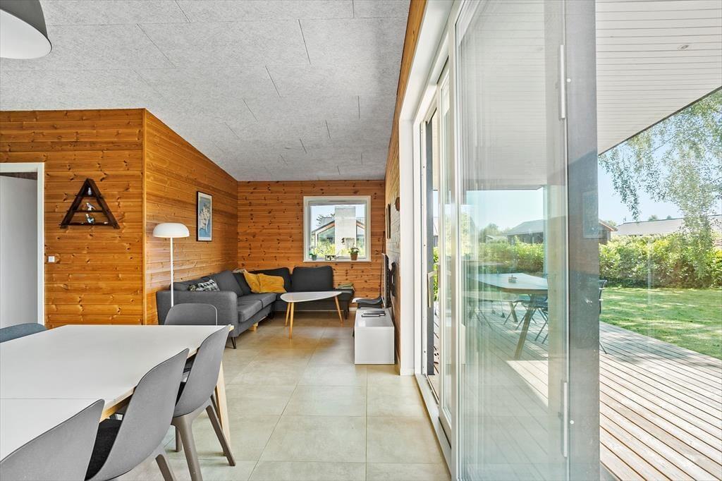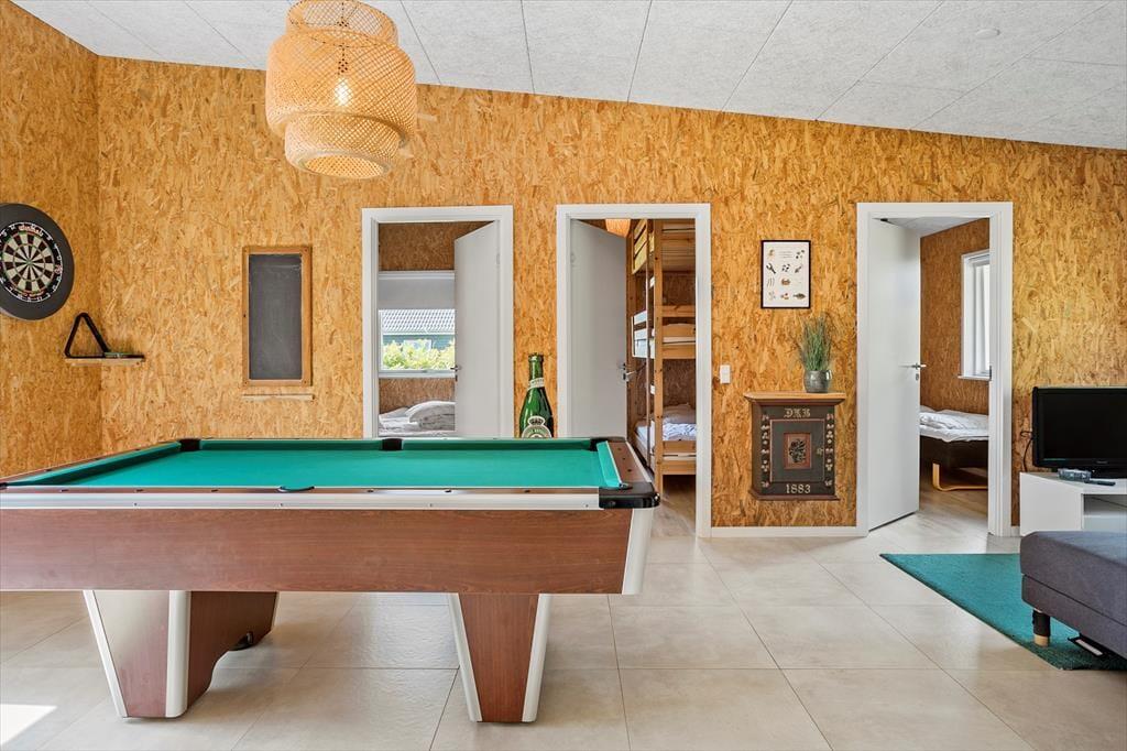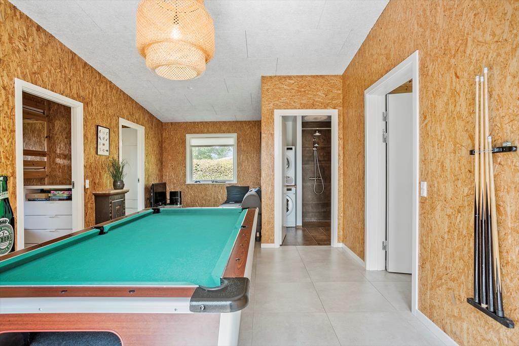 Flot og moderne træfritidshus som overalt fremstår i pæn og lys stand, og som tilbyder et køkken-alrum med sofakrog, spiseplads og køkken, 2 gode badeværelser hvoraf det ene er med et 2-personers spabad, sauna, bruser, WC og vaskesøjle, og det andet badeværelse er med WC og bruser. Derudover er huset også udstyret med et godt aktivitetsrum med billard, dart og sofakrog og i alt 5 soveværelser.
