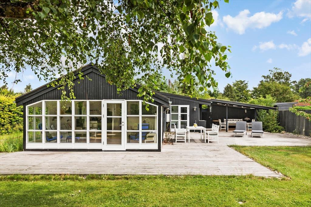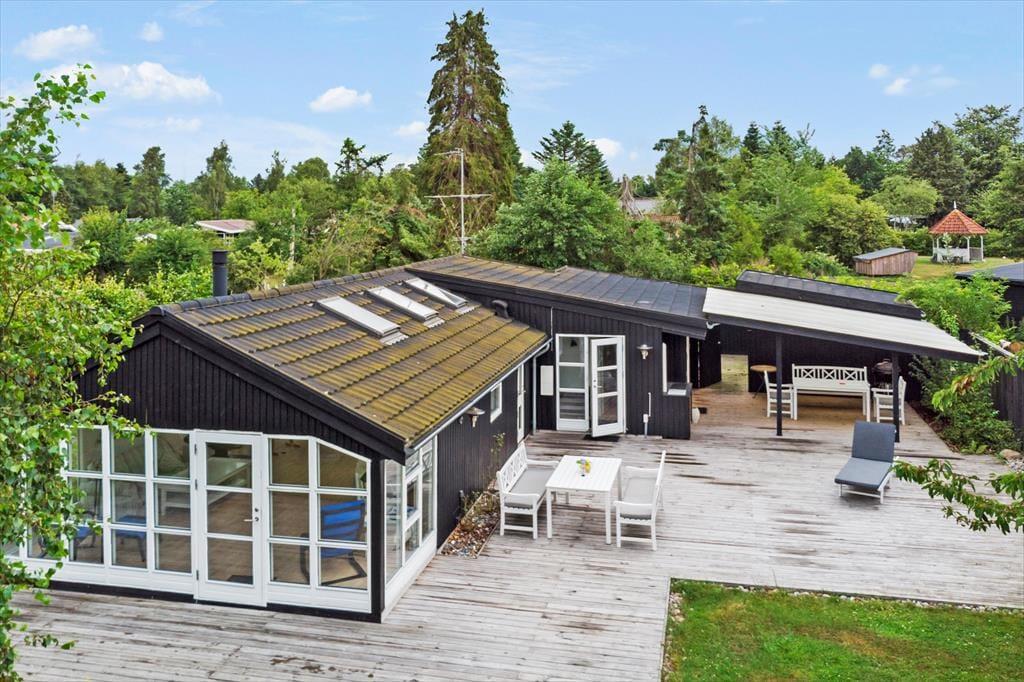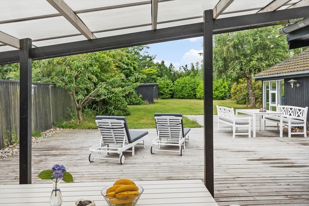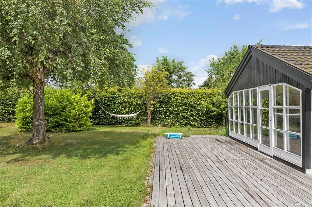 Feriehuset er beliggende på en 1200 kvm stor grund i et roligt område i det nordlige Marielyst. Udendørs er den skønneste store terrasse, godt indrettet med masser er siddepladser, grill og en stor græsplæne med masser af plads til at børnene. En del af den skønne terrasse er overdækket.