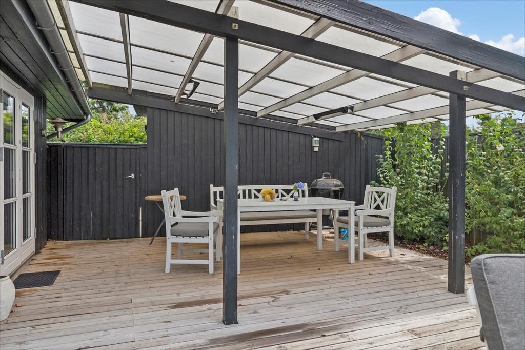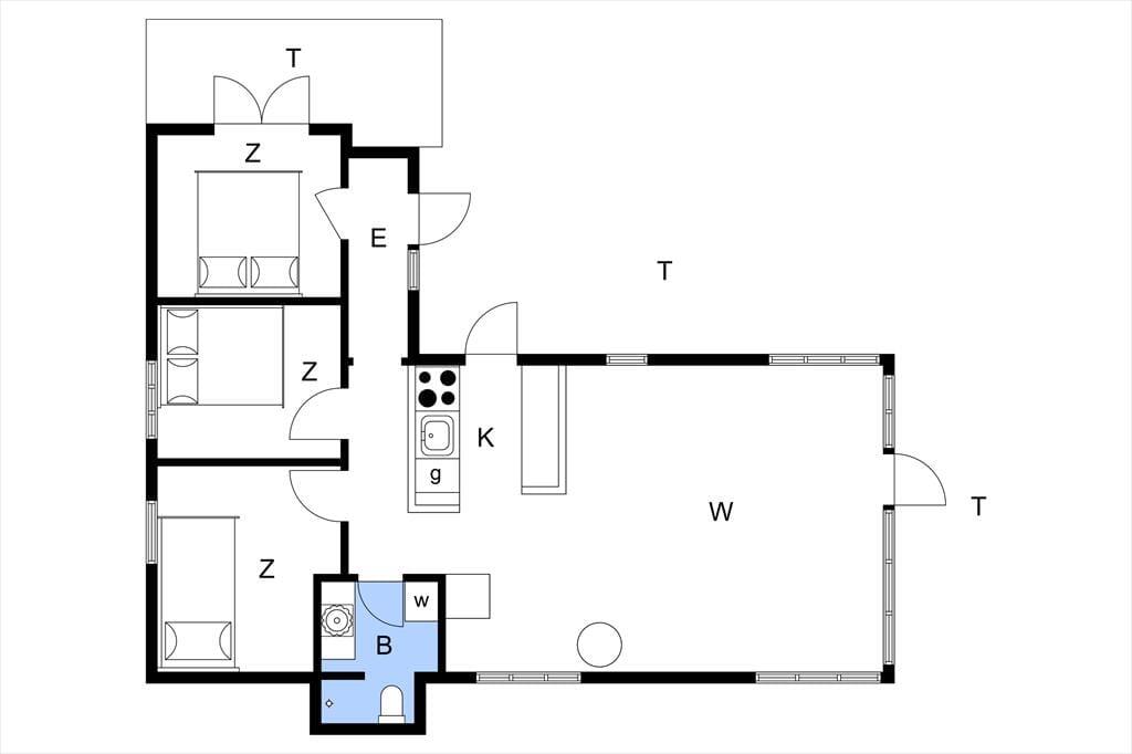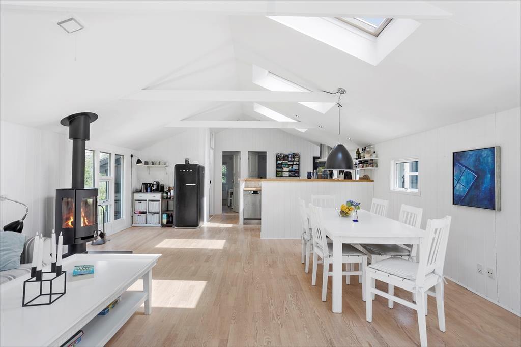 Dette skønne feriehus indeholder: badeværelse med bruser og wc samt vaskemaskine, derudover er der gulvvarme i feriehusets badeværelse. Herudover indeholder feriehuset 3 gode soveværelser med dobbeltseng i 2 af værelserne og 1 enkeltmandsseng i det tredje værelse. Feriehuset har et skønt åbent køkken mod spisestue og stuen. Fra køkken og stue er der udgang til den skønne terrasse.