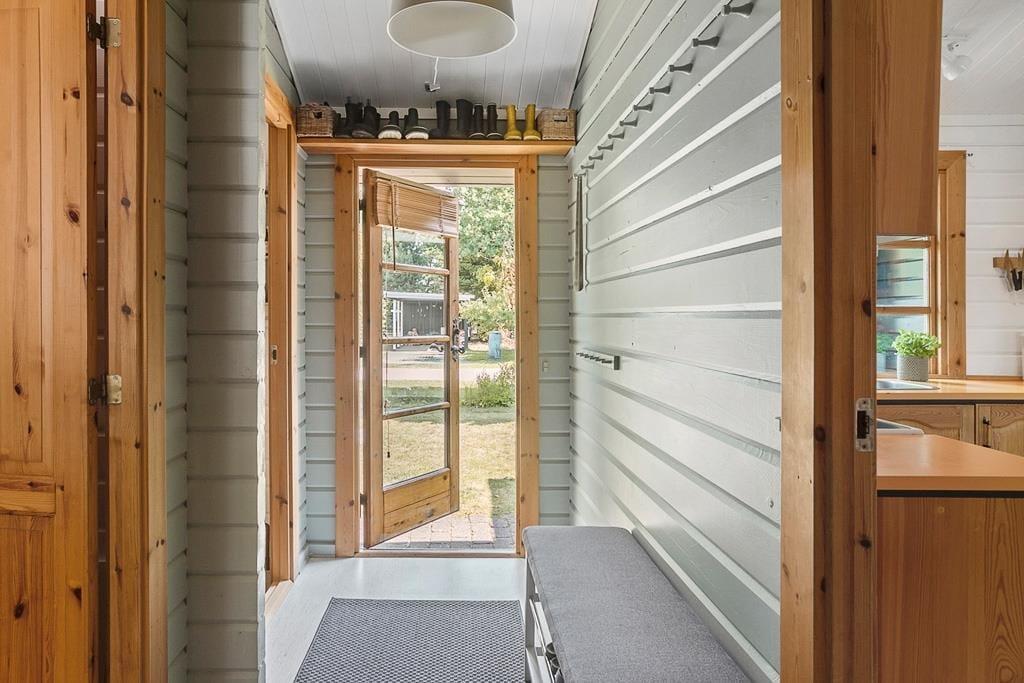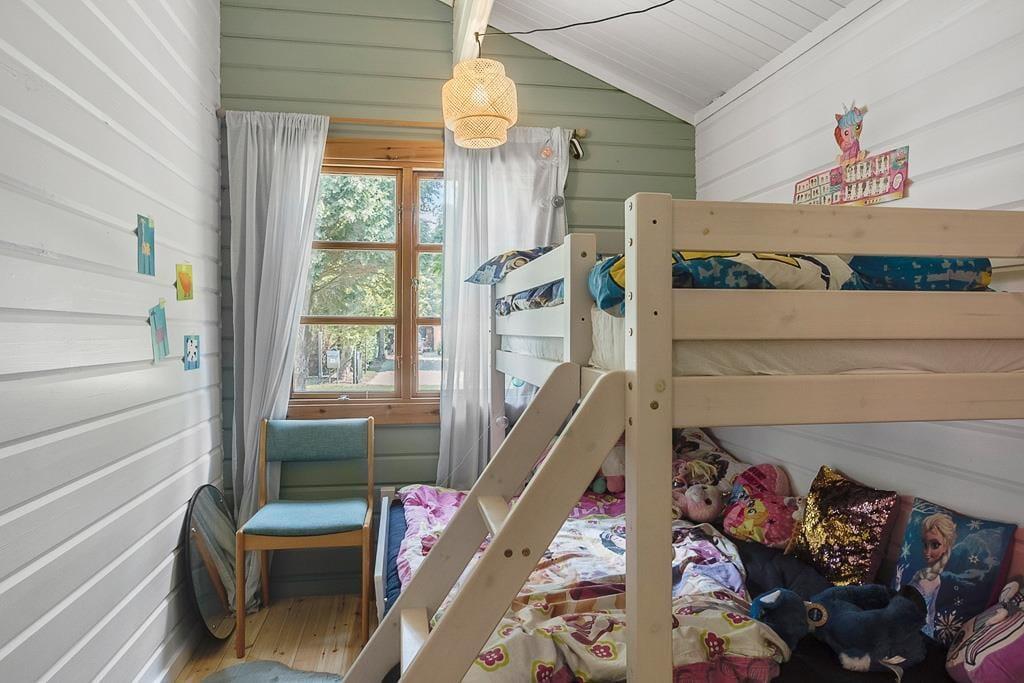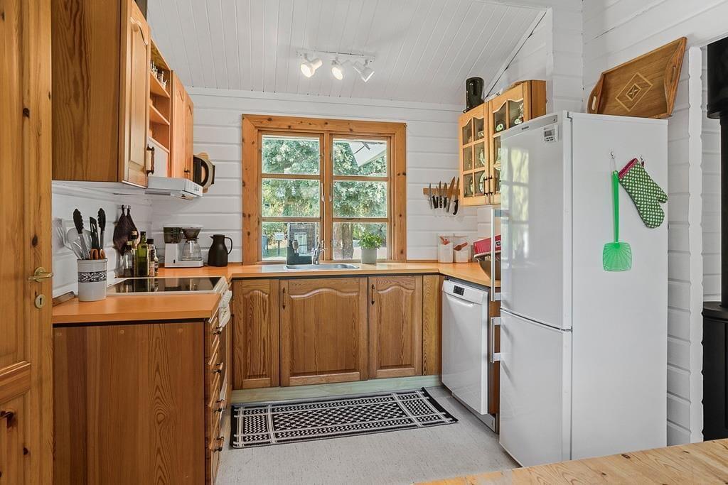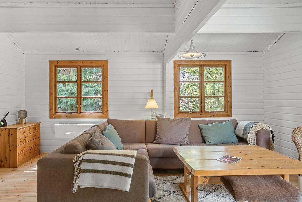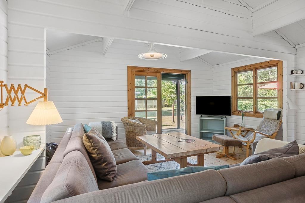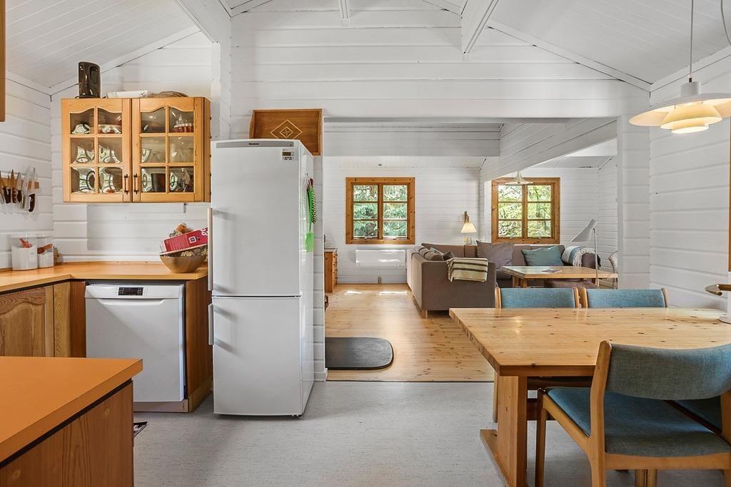 Lyst og charmerende sommerhuset som indeholder 3 soveværelser, 2 af værelserne med dobbeltseng og 1 værelse med køjeseng, derudover er der et dejligt åbent køkken med spiseområde, en stue med sofaområde, tv og brændeovn, med udgang til terrasse, til sidst et badeværelse med WC og bruser.