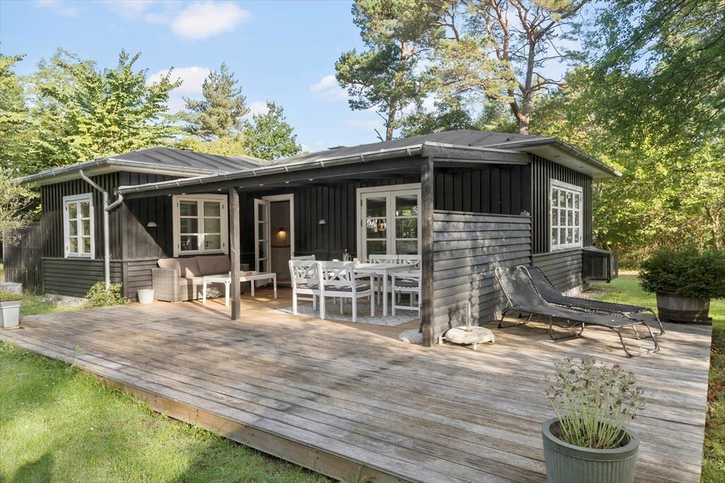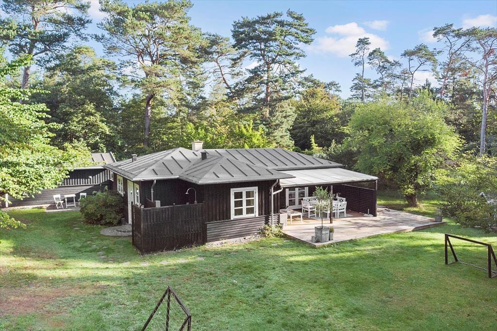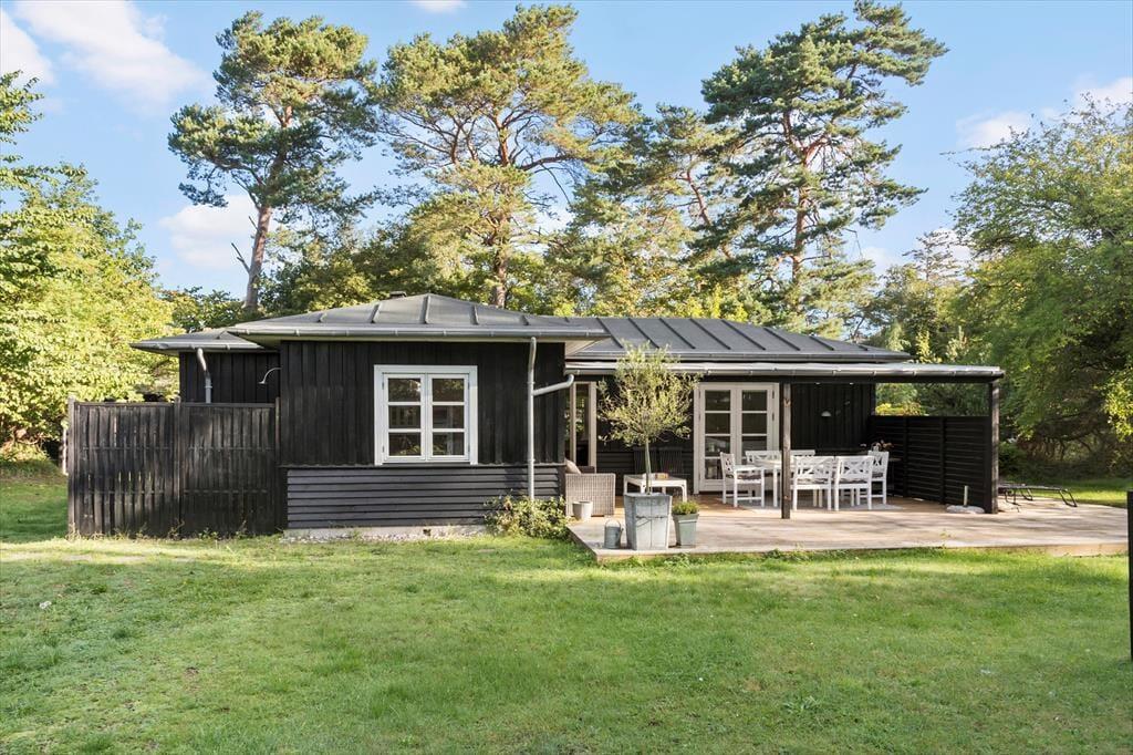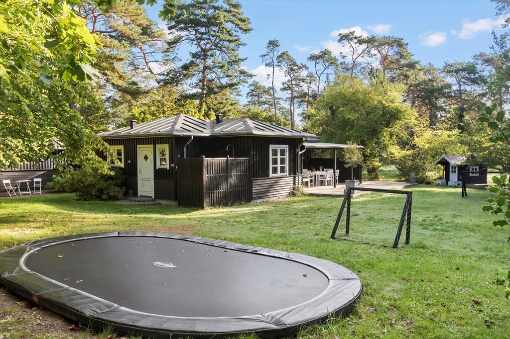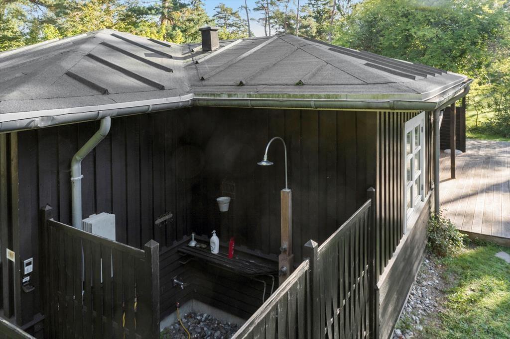 Fritidshuset er beliggende på en 1460 kvm stor grund, hvor der er plads til en masse sjov og leg. Til huset er en skøn overdækket terrasse, hvor der er havemøbler og grill. Derudover er der trampolin og udendørsbruser i haven.