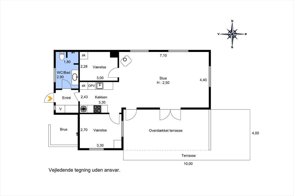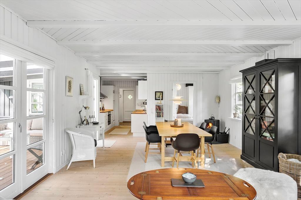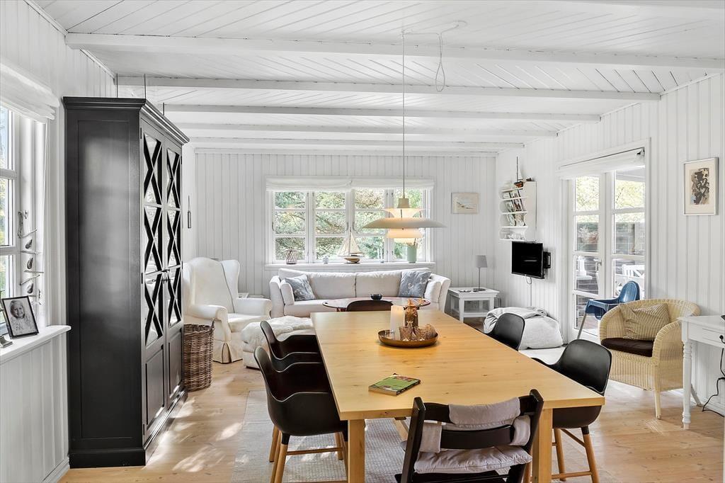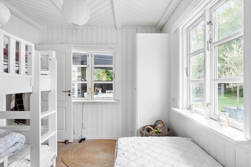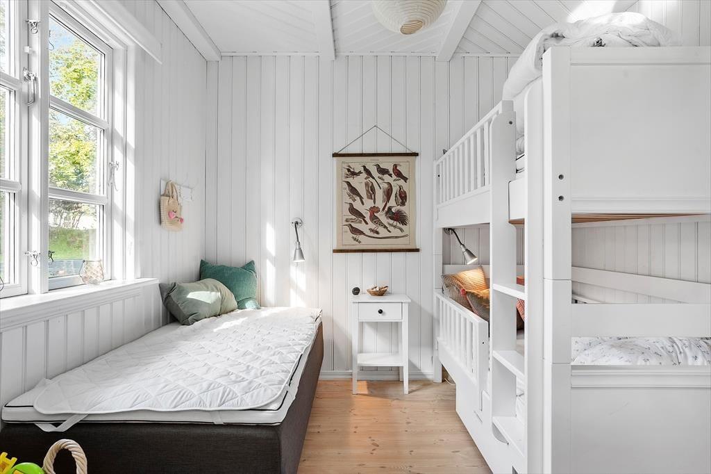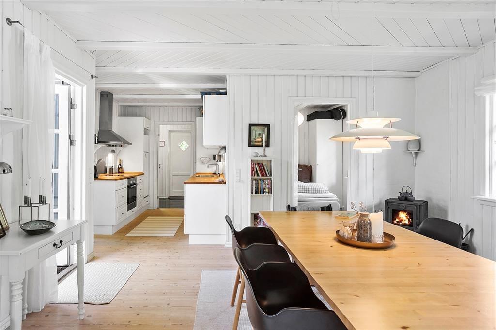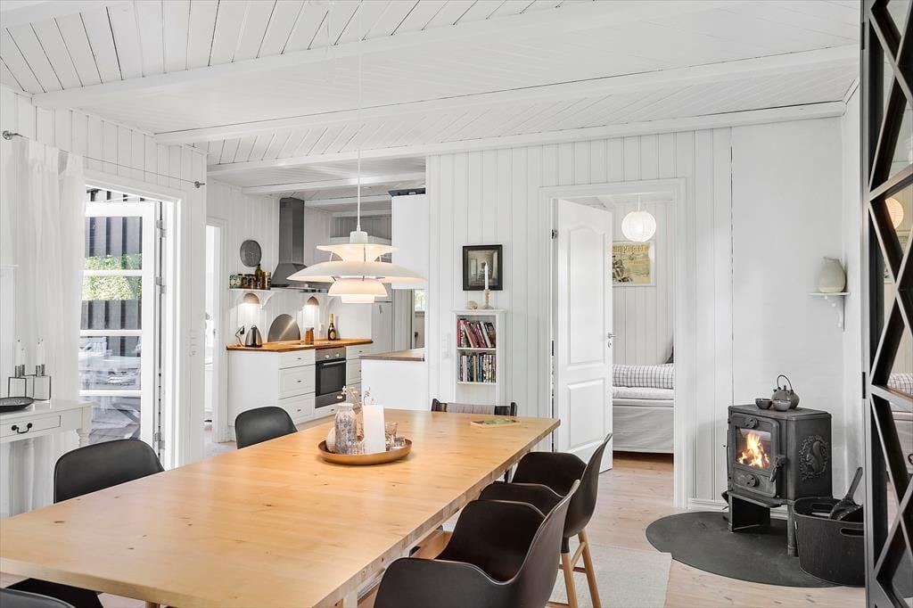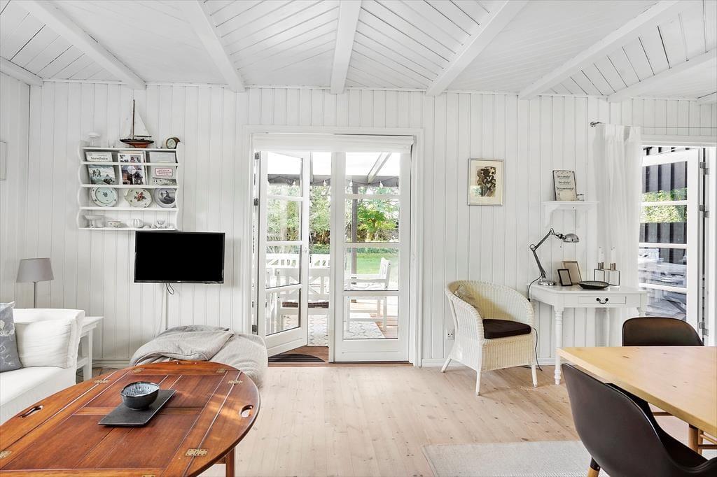 Dette skønne fritidshus byder på entre med vaskemaskine, fra entreen er der indgang til husets badeværelse med wc og bruser. Dernæst har huset 2 soveværelser med dobbeltseng i det ene af soveværelserne og køjeseng, samt en enkeltmandsseng i det andet soveværelse. Huset har et dejligt åbent køkken, samt en stue med spiseområde og sofaafdeling. Fra stuen er der udgang til husets skønne overdækkede terrasse.