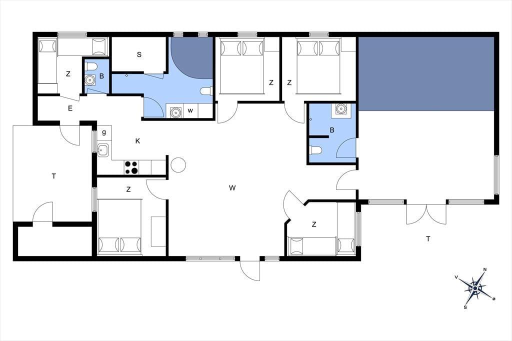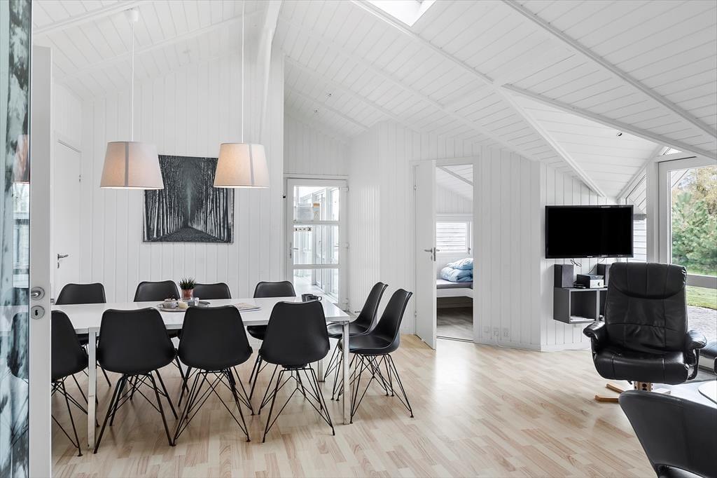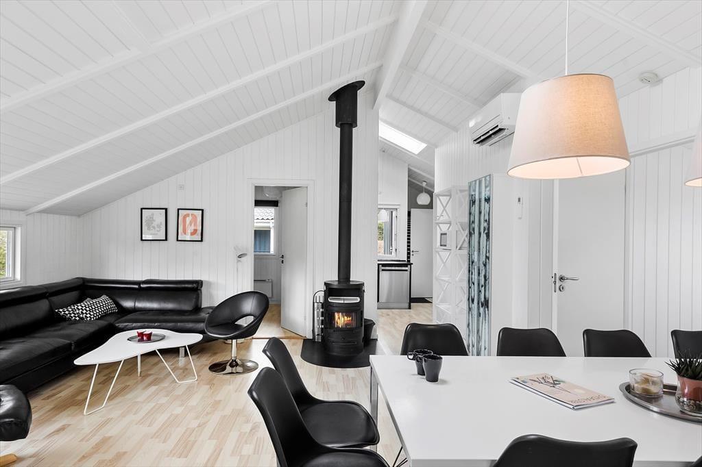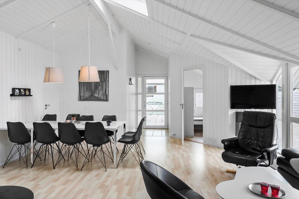 Dejligt fritidshus som er indrettet i god lys stil, og byder på 5 gode soveværelser med i alt 10 sengepladser, 2 badeværelser, og 1 toilet, et køkken i åben forbindelse med stuen, som er opdelt med spiseafdeling i den ene side og sofa og tv-hjørne i den anden side, og som også byder på udgang til terrassen. Derudover byder feriehuset på sauna og indendørs spabad. Sidst men ikke mindst, ligger swimmingpoolen for enden af stuen, hvor også det ene badeværelse befinder sig.