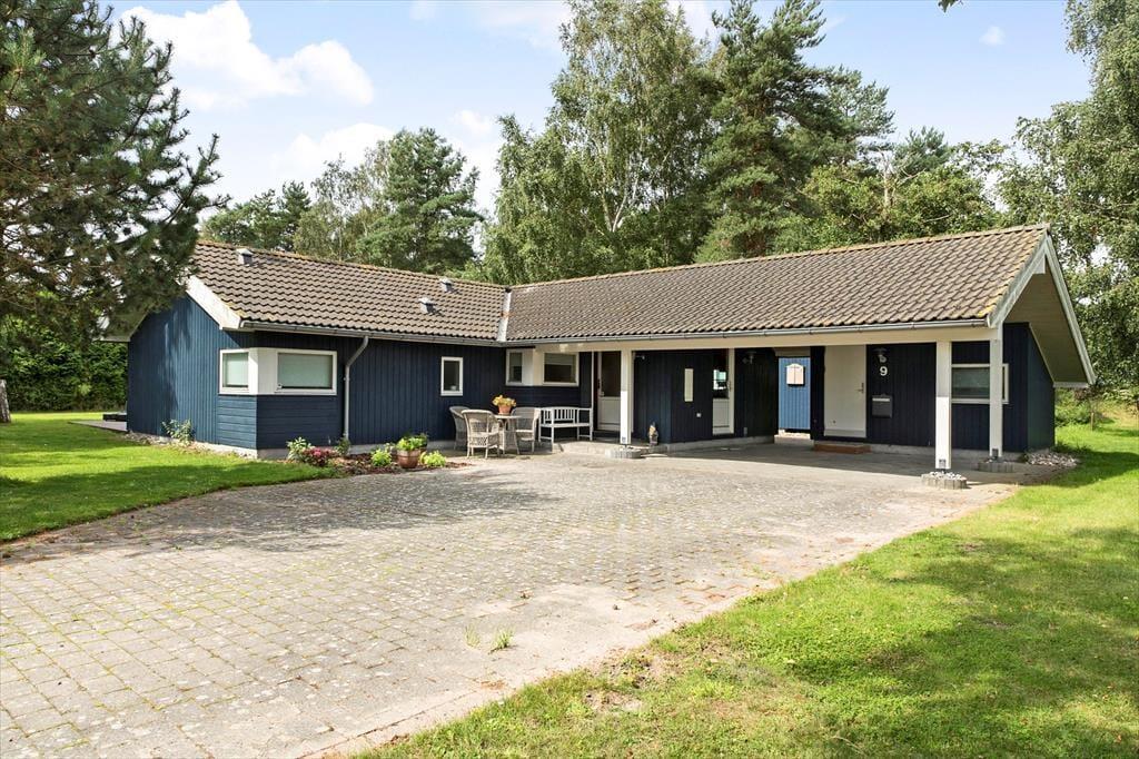 Feriehuset er beliggende på en 969 m2 stor grund med masser af plads til aktiviteter på den skønne græsplæne. Til feriehuset er en stor skøn terrasse, der er delvist overdækket. På terrassen er der havemøbler og grill. I haven er der shelter og bålplads. Dernæst er der et skønt vildmarksbad, hvor du kan nyde udsigten over landskabet. Derudover er der carport til feriehuset.