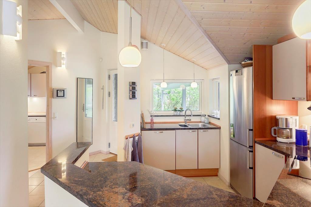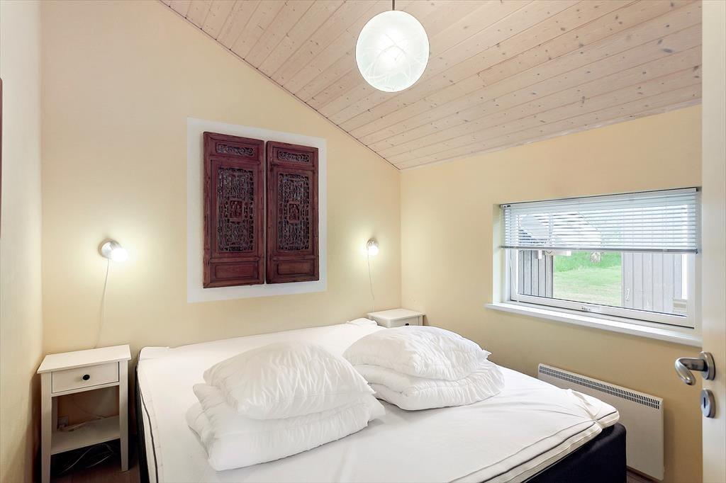 Dette skønne feriehus består af en entre, med indgang til bryggers hvor der er vaskemaskine og tørretumbler. Dernæst går man direkte ind til feriehusets åbne køkken, hvor der er spiseområde og stue. Fra stuen er der udgang til feriehusets skønne delvist overdækket terrasse. Feriehuset har et badeværelse med wc, bruser og badekar. Derudover er der et toilet med toilet og håndvask. Dernæst er der 3 gode soveværelser med dobbeltsenge i alle værelserne.