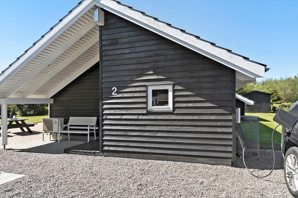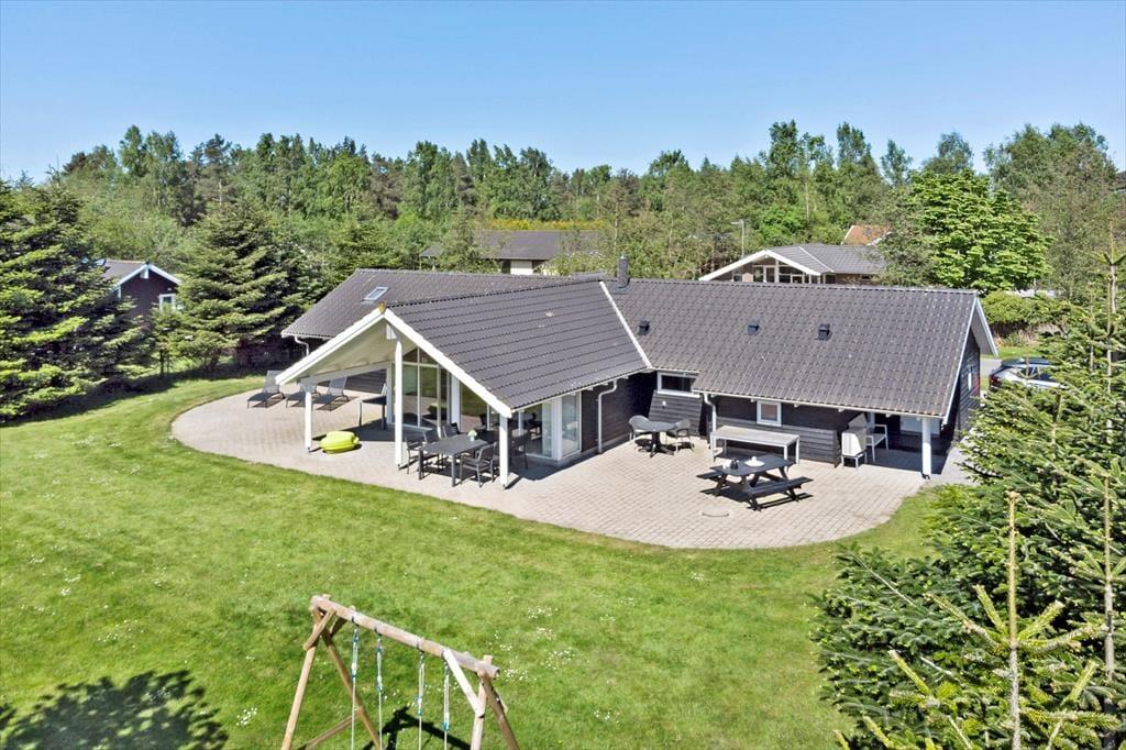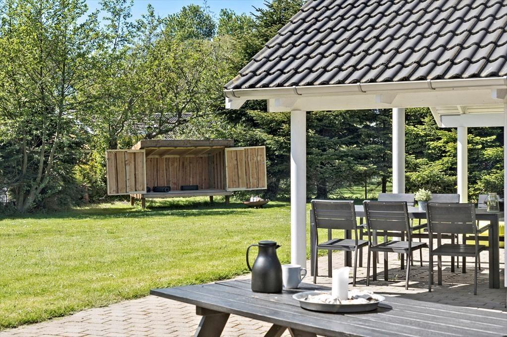 Feriehuset er beliggende på en 1050 m2 stor grund med masser af plads til aktiviteter på den skønne græsplæne. Til feriehuset er en stor skøn terrasse, der er delvist overdækket. På terrassen er der havemøbler, grill og liggestole. I haven er der sandkasse, gynge, bål sted og shelter, så der er en masse aktiviteter, både til store og små. Haven er derudover lukket af.