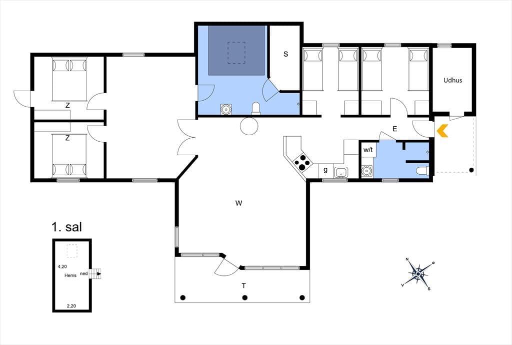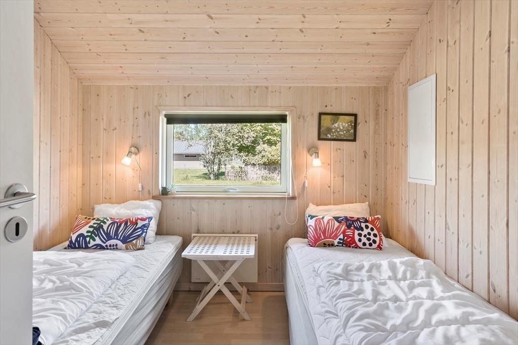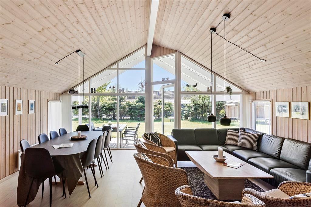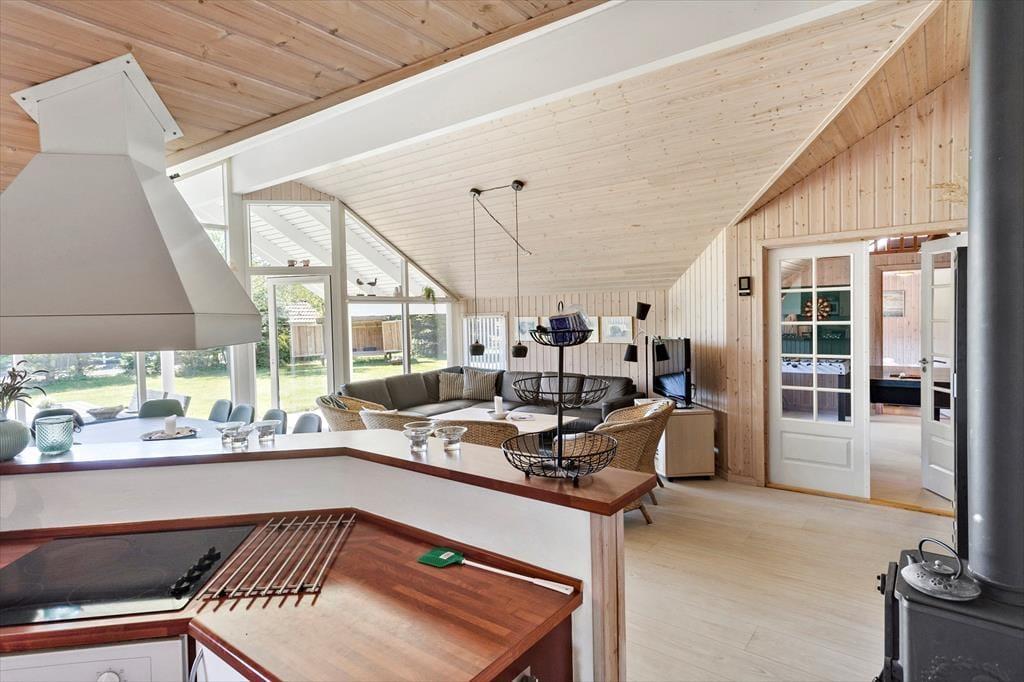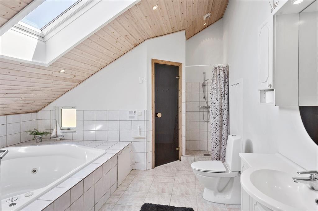 Dette skønne feriehus består af en entre, 4 gode soveværelser, hvor der er dobbeltseng i 2 af soveværelserne og 2 enkeltmandssenge i de andre 2 soveværelser. Det sidste soverum er husets hems, hvor der er 4 madrasser. Derudover har feriehuset 2 badeværelser, hvor der i det ene er wc, bruser, vaskemaskine og tørretumbler og i det andet er der wc, bruser, spabad og sauna. Hernæst har feriehuset et skønt åbent køkken, med udgang til spiseområde og stuen. Fra stuen er der udgang til feriehusets skønne terrasse og have.