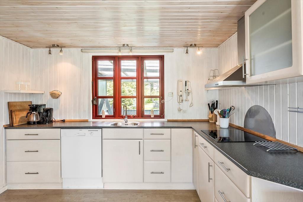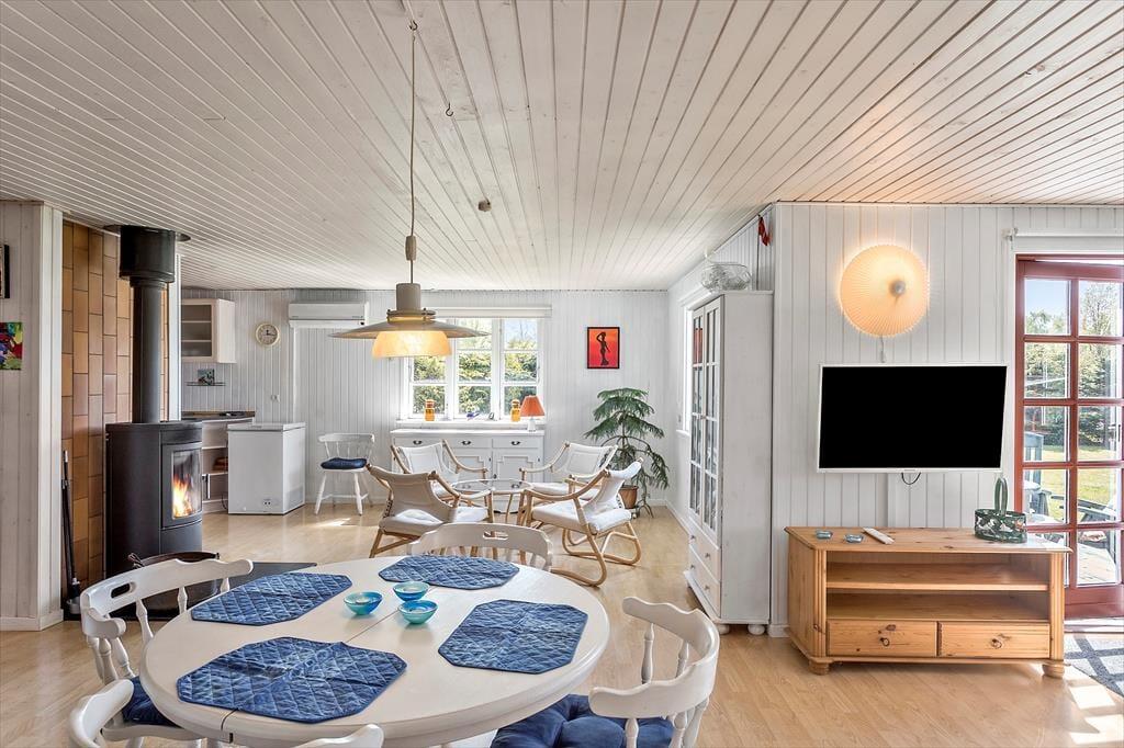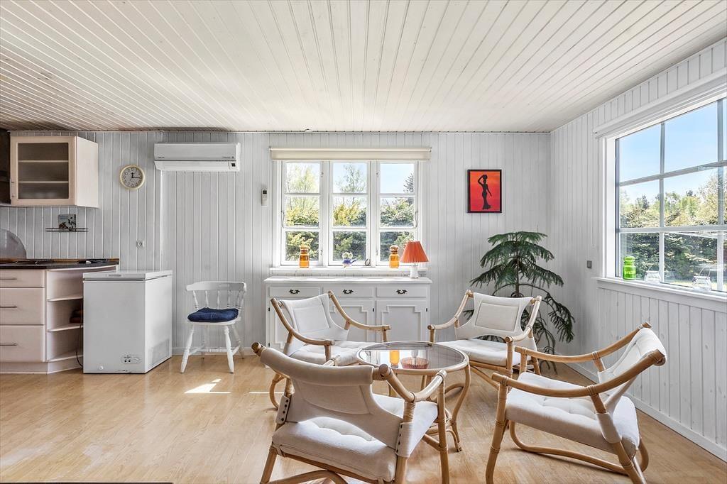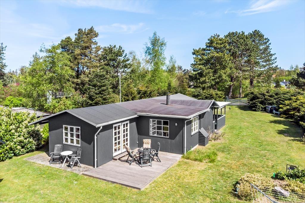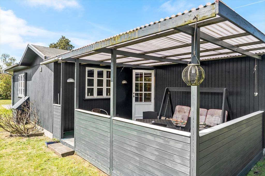 Dette skønne fritidshus ligger kun 350 meter fra vandet. Derudover ligger huset på en 1200 kvm grund. Feriehuset byder på to skønne terrasser, hvor den ene er overdækket. På terrassen er der havemøbler og grill. Grunden er lukket helt af.