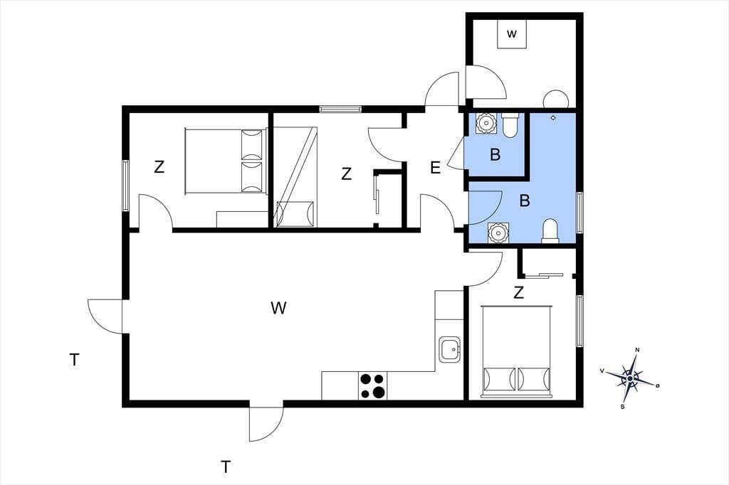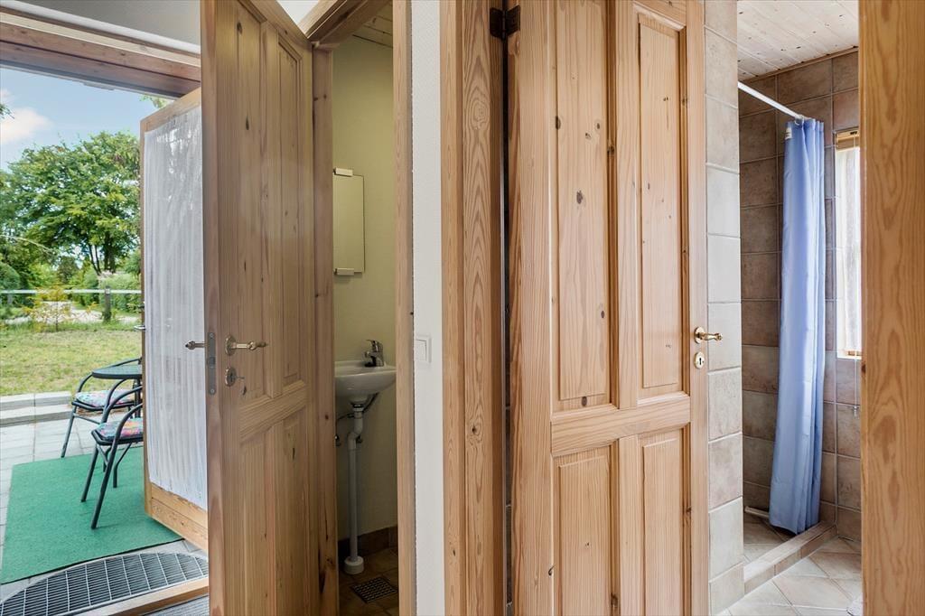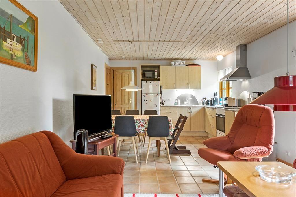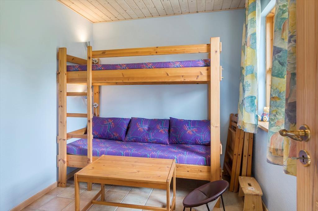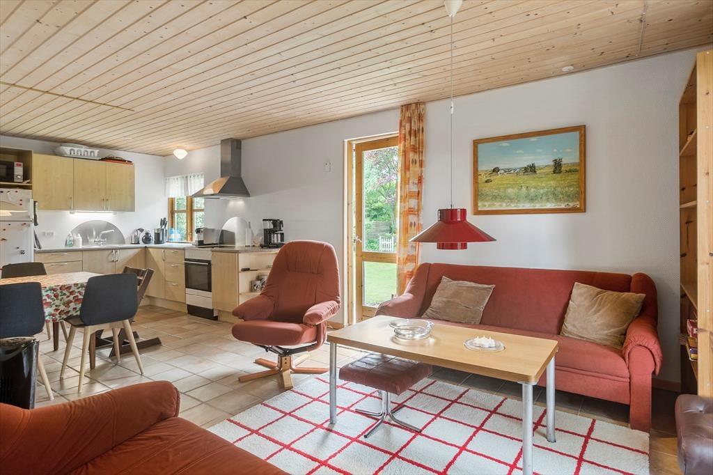 Feriehuset byder på en entre, dernæst et gæstetoilet med wc og håndvask. Et badeværelse med wc, håndvask og bruser. Feriehuset har 3 soveværelser, hvor en er med dobbeltseng, 1 med en køjeseng og 1 værelse med en dobbelt sovesofa. Til sidst husets hjerte, som byder på et dejligt åbent køkken med spiseområde og udgang til stuen. Fra køkkenet og stuen er der udgang til husets skønne terrasse.