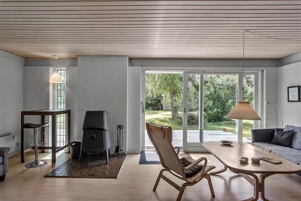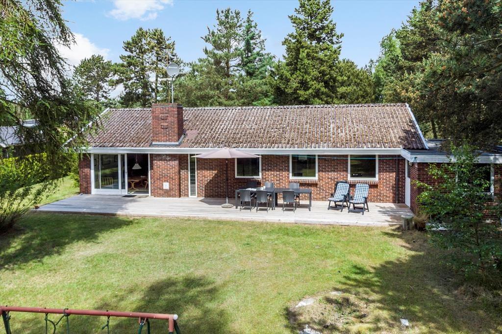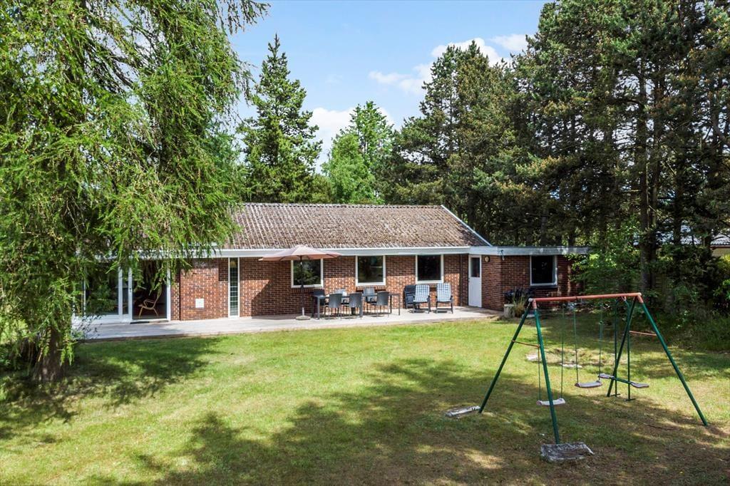 Udenfor byder huset på en dejlig sydvendt træterrasse, hvor solen kan nydes dagen lang. I haven er der et lille gyngestativ til de mindste, mens der også er god plads til grill eller boldspil.