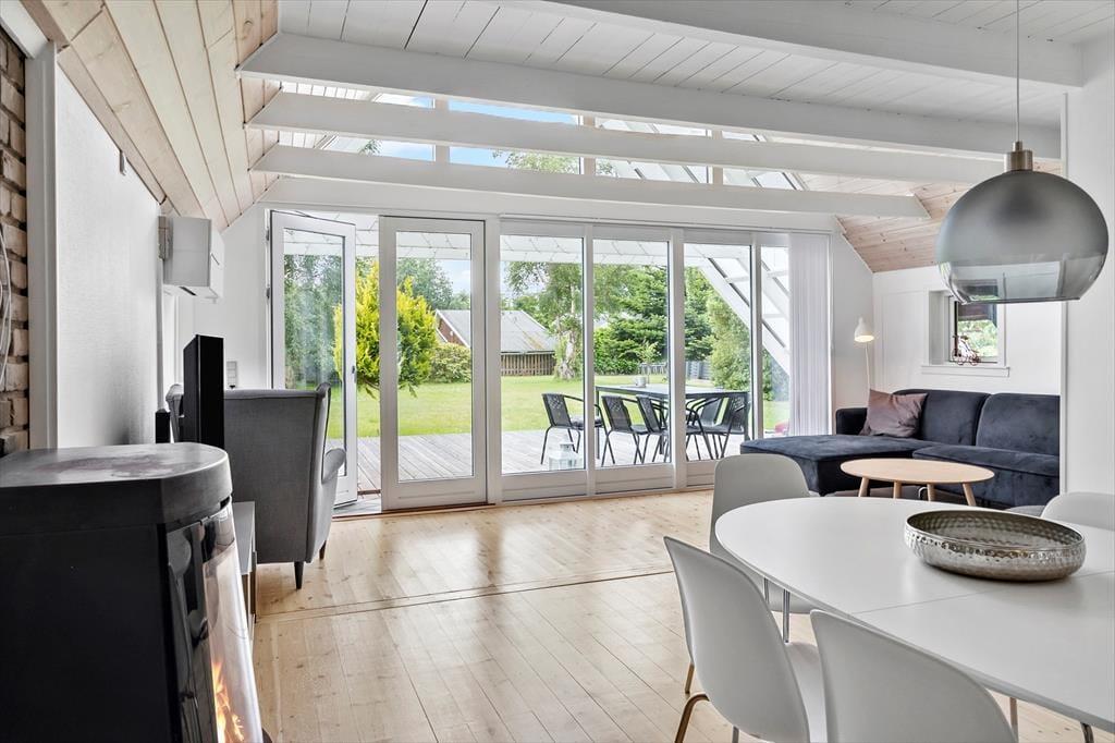 Dette feriehus indeholder 2 gode soveværelser med dobbeltseng i begge, derudover er der en hems med 2 enkeltmandssenge. Det ene soveværelse ligger i stueetagen, hvor de andre sovepladser ligger på feriehusets 1 sal. Derudover har feriehuset et køkken, men udgang til spisestue og stue. I stuen er der et dejligt stort vinduesparti, hvor der er udgang til feriehusets skønne terrasse og have.