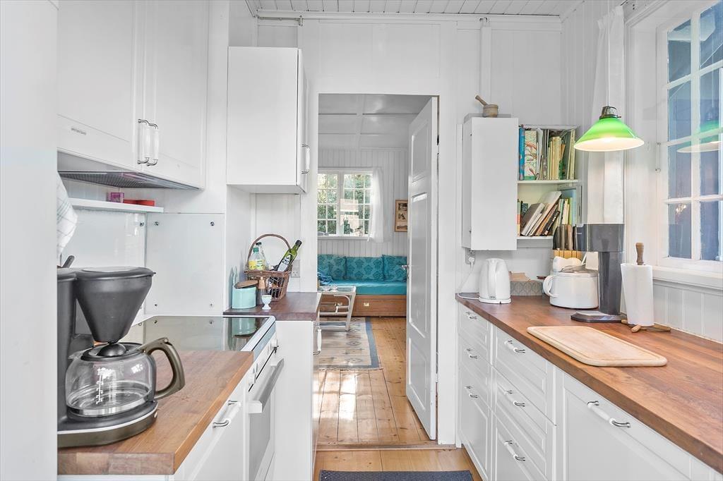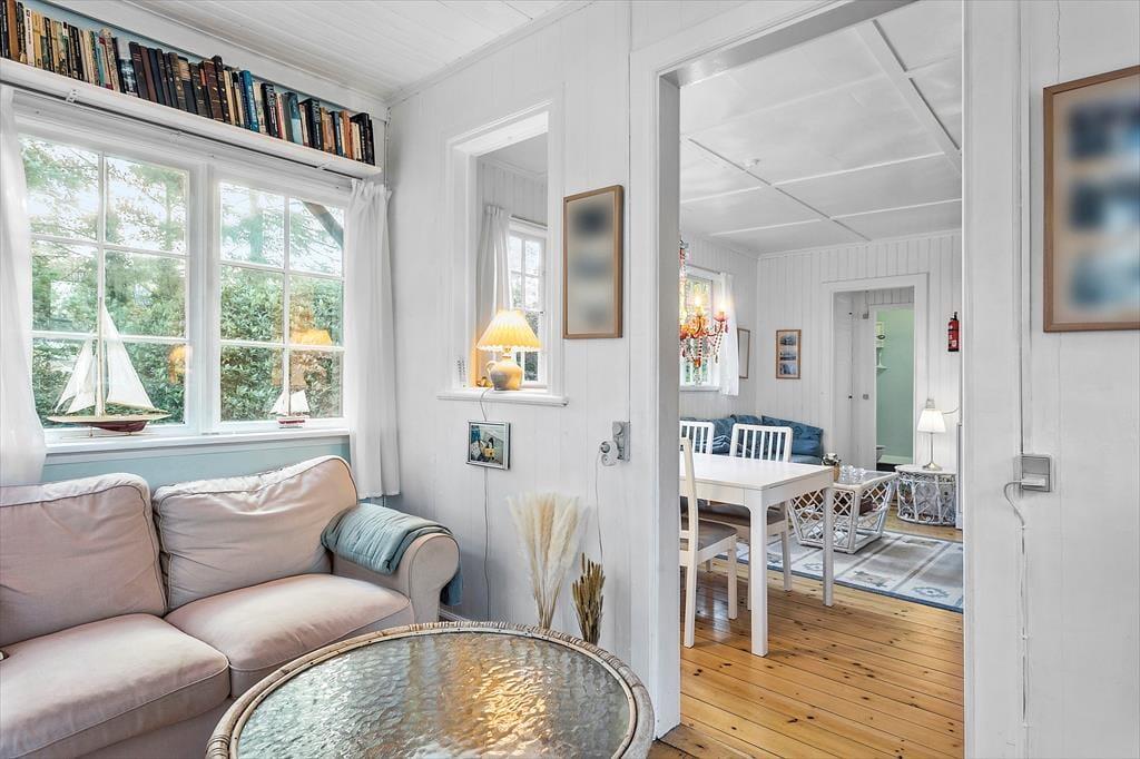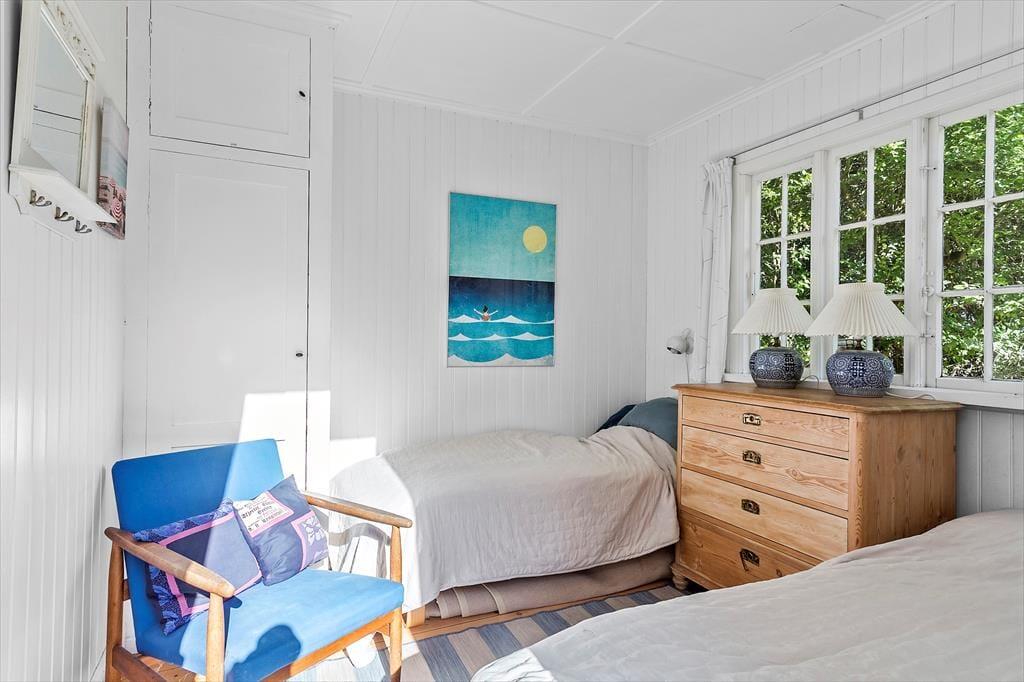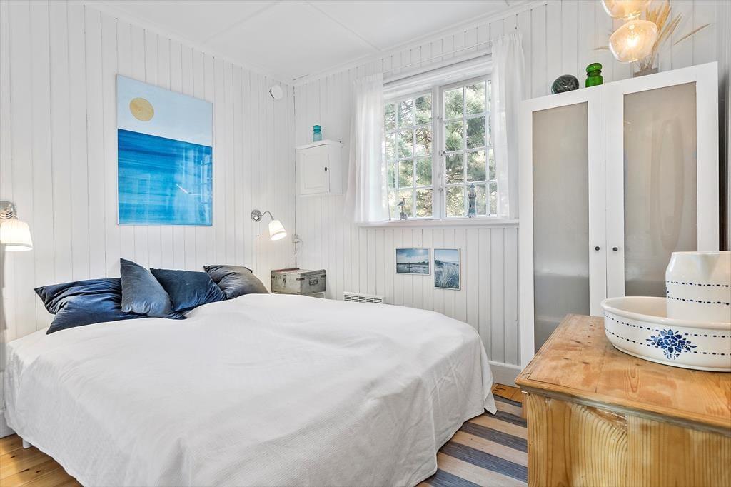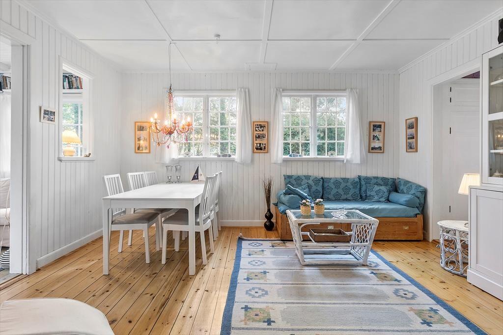 Med over 100 år på bagen er dette sommerhus i første række til stranden et af Marielysts mest originale og karakterfulde. Det er nænsomt restaureret, så det i dag fremstår i vaskeægte beach-house-stil, der så at sige bringer stranden med helt ind i huset. Feriehuset byder på en entre, 1 badeværelse med wc og bruser. Derudover er der 2 soveværelser, hvor der er dobbeltseng i det ene soveværelse og 2 enkeltmandssenge i det andet. Derudover har feriehuset et helt nyt køkken, med udgang til spisestue og en stue med vinduer hele vejen rundt, hvor man omsluttes af de grønne træer. Fra stuen er der udgang til feriehusets mange skønne, solrige terrasser. Ved feriehusets hovedterrasse er der et anneks hvor der er et soveværelse med 2 enkeltmandssenge. I annekset er der også et badeværelse med wc, bruser og vaskemaskine.