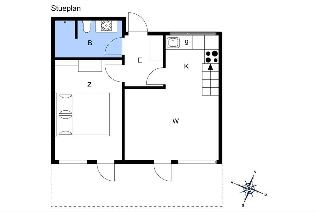 Lejligheden består af entre, fra entreen er der indgang til badeværelse med toilet, bruser og håndvask. Derudover er der et soveværelse på stueetagen hvor der er dobbeltseng, skab, samt udgang til terrasse. På førstesalen er endnu et soveværelse med to enkeltmands senge. Til sidst byder lejligheden på åbent køkken, med udgang til stue og spiseafdeling, hvor der også er udgang til terrassen.