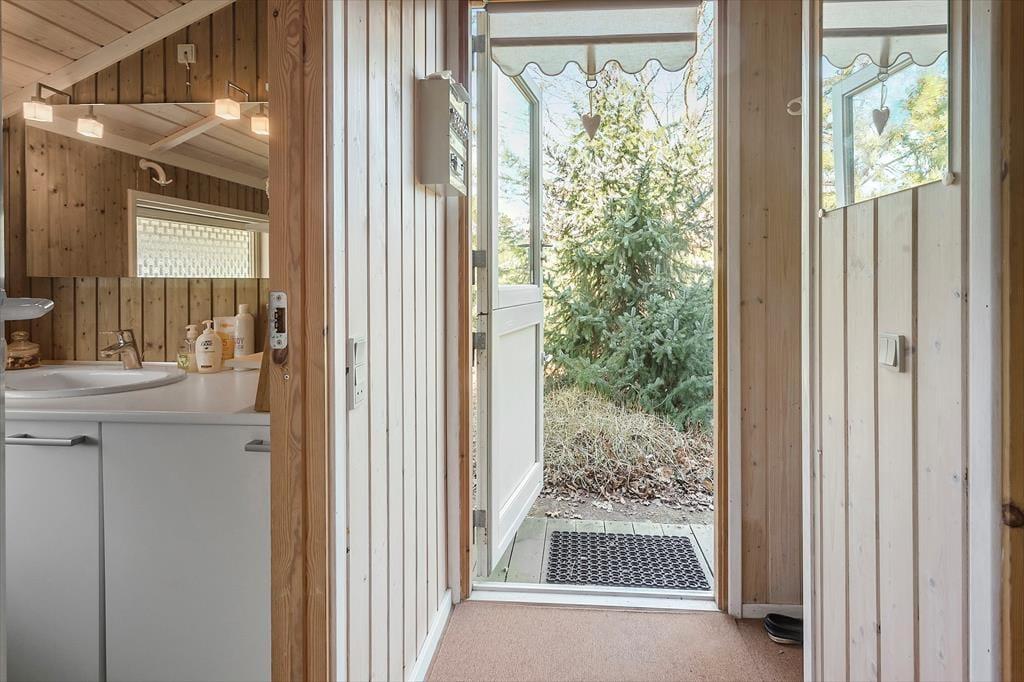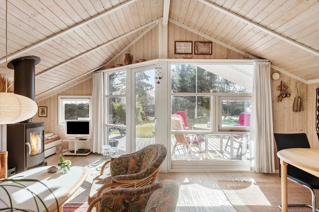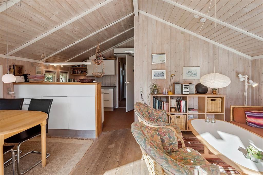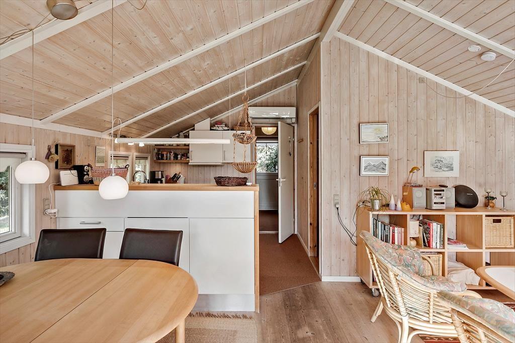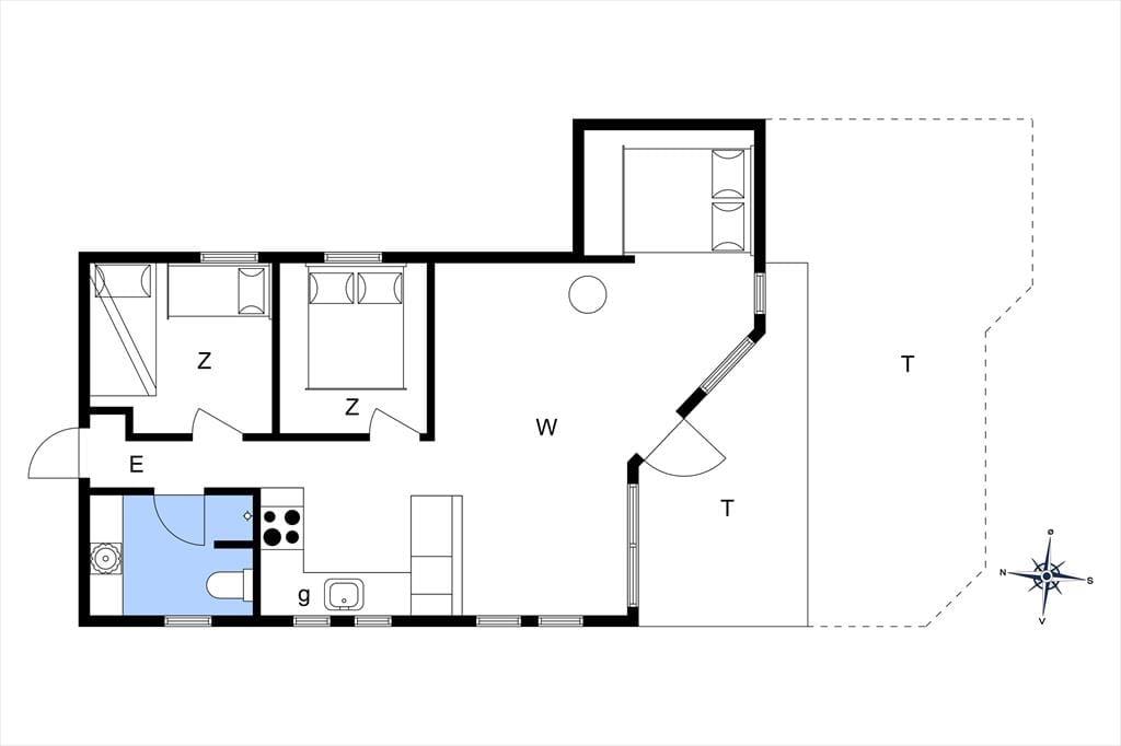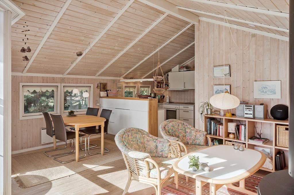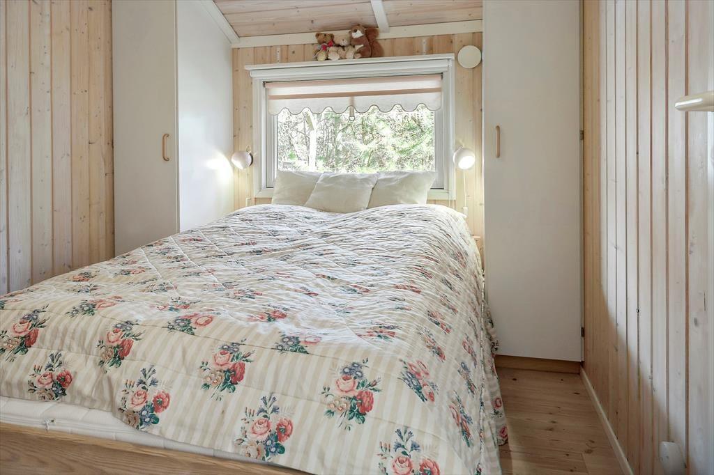 Dette hyggelige sommerhus byder på en entre, 2 gode soveværelser, med dobbeltseng i det ene og 1 enkeltmandsseng i det andet, samt en køje. Derudover har huset et åbent køkken, med udgang til stue og spisestue. I stuen er en hygge alkove, hvor der er en dobbeltseng. Fra stuen er der udgang til husets skønne terrasse. Til sidst har huset et badeværelse med wc og bruser.