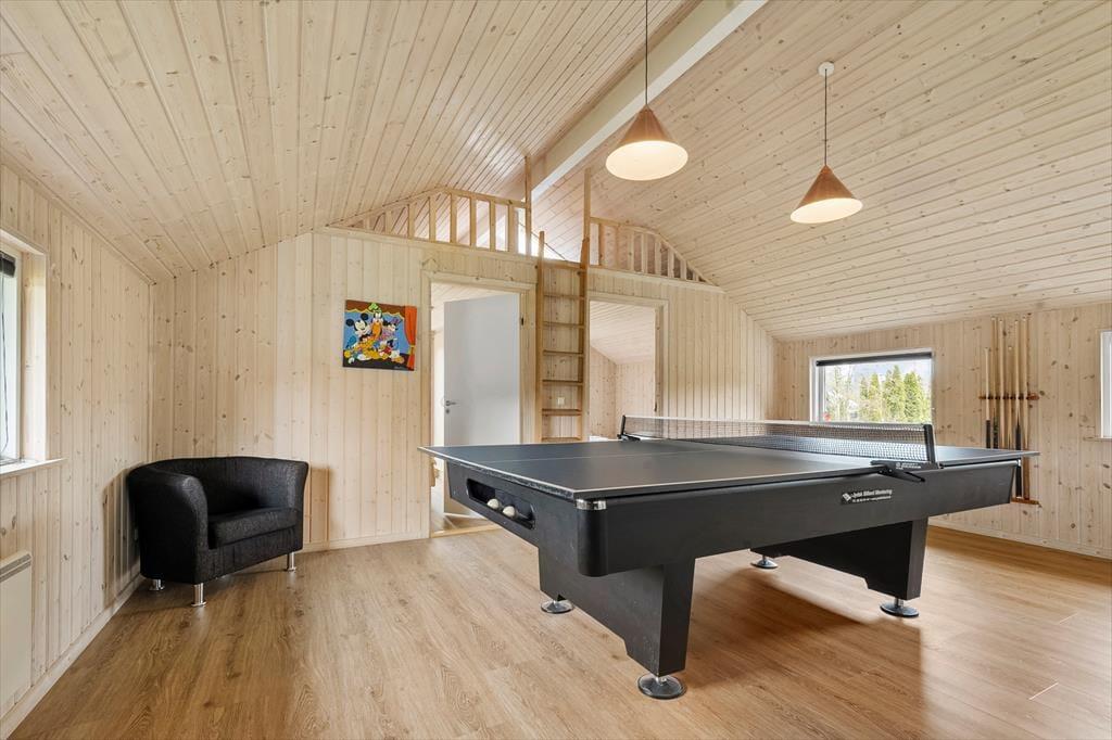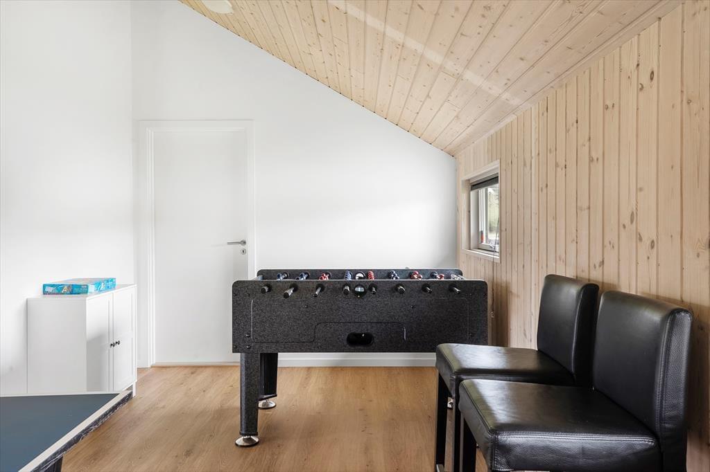 Sommerhuset har et aktivitetsrum med bordfodbold, billard og bordtennis. Her kan mange sjove timer nydes sammen med dem du holder.