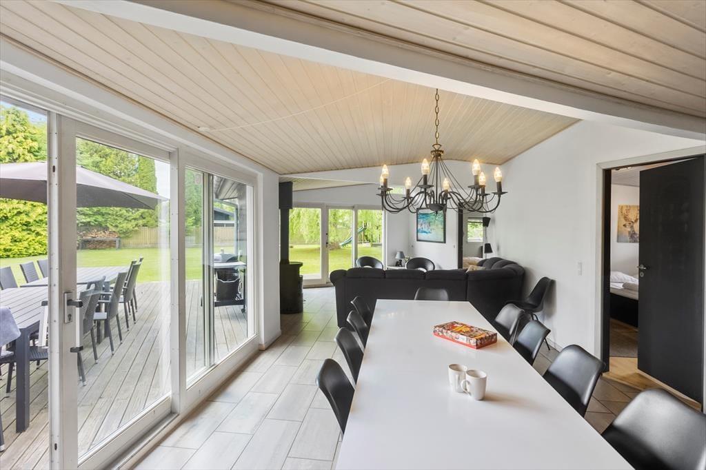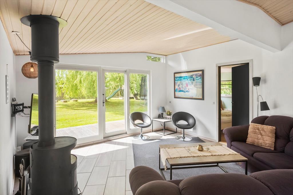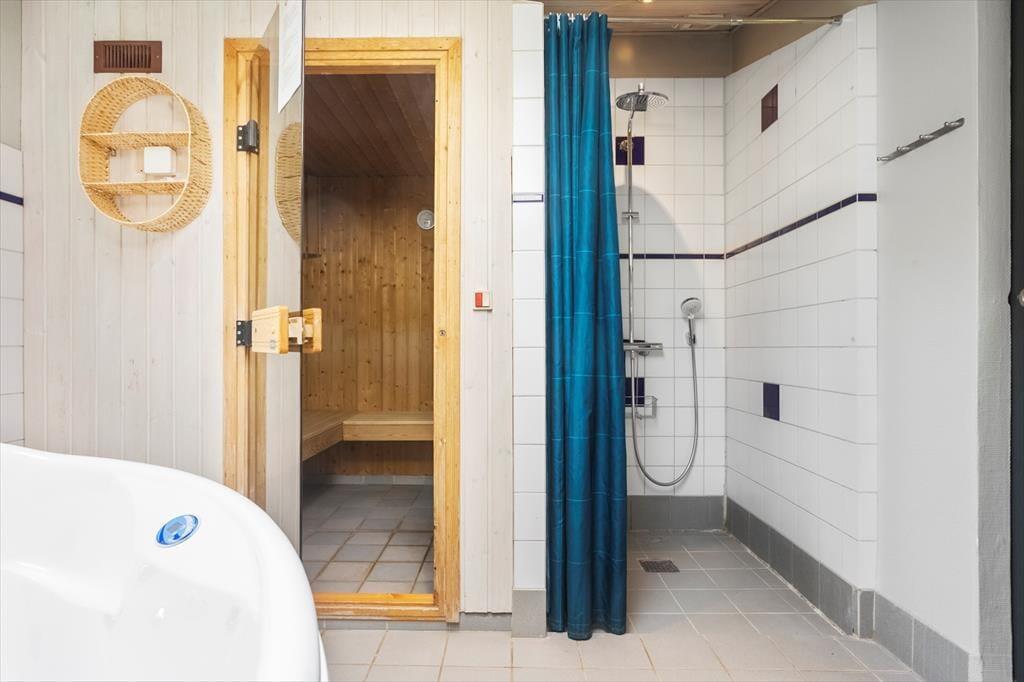 Huset har et stort badeværelse med toilet, bruser, vaskemaskine, tørretumbler, spabad og sauna – samt et ekstra gæstetoilet med wc og håndvask. Hjertet af huset er det åbne køkken-alrum, hvor køkken, spiseplads og stue smelter sammen i én hyggelig helhed. Fra stuen er der direkte adgang til en skøn, solrig terrasse.