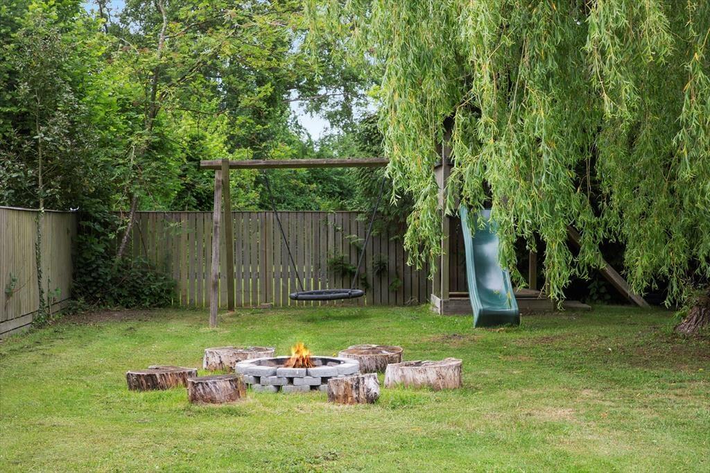 Grunden er på 1.000 m² og byder på en dejlig terrasse med havemøbler og grill – perfekt til sommeraftener under åben himmel. Den store græsplæne giver masser af plads til leg, boldspil og afslapning. Der er naturligvis parkering lige ved huset.