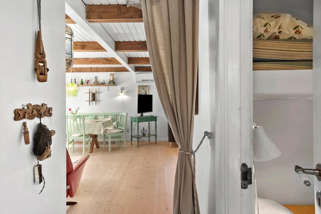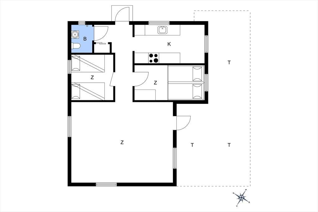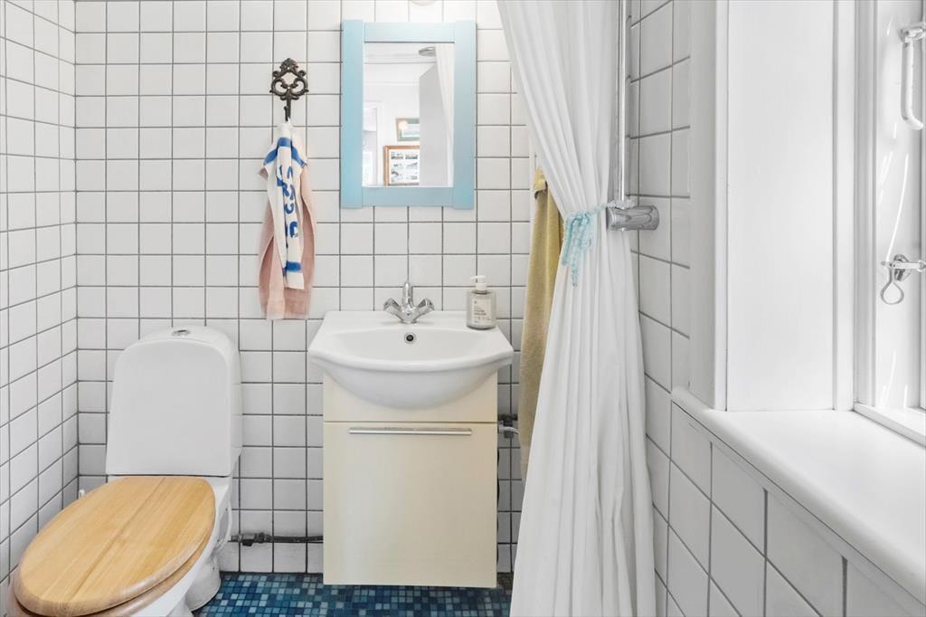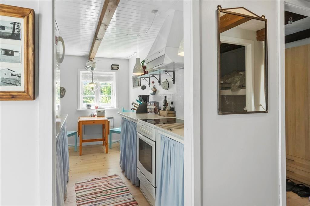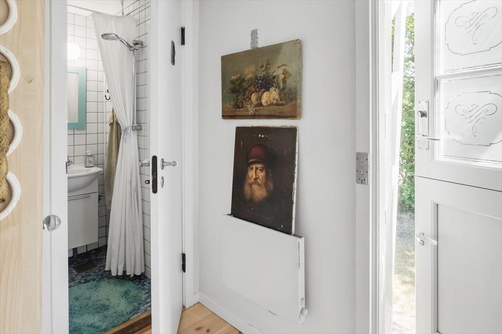Huset har en lille entré, hvorfra der er adgang til badeværelset, som er udstyret med både toilet og bruser. Køkkenet er funktionelt og har en lille spiseplads til to – ideel til morgenkaffen eller et hurtigt måltid.