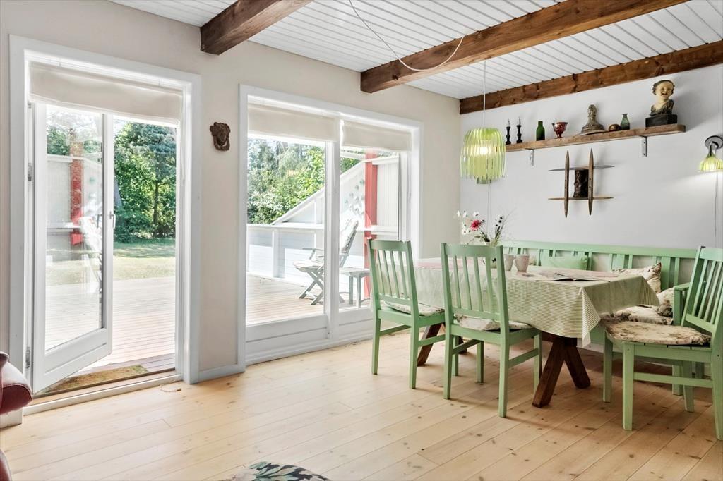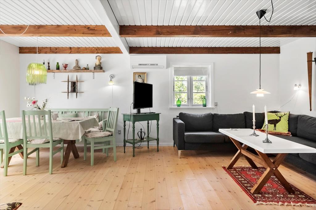 Husets hjerte er den lyse og indbydende stue, som rummer både sofahjørne og spiseafdeling. Herfra er der direkte adgang til en dejlig terrasse og den grønne have, hvor I kan nyde solen og roen.