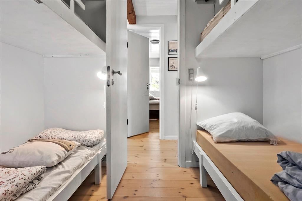 Der er to soveværelser: det ene med to enkeltsenge, og det andet med to køjesenge – God til både voksne og børn.