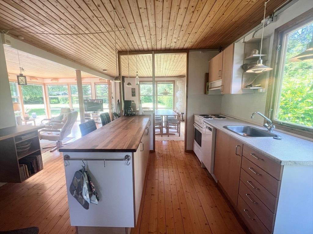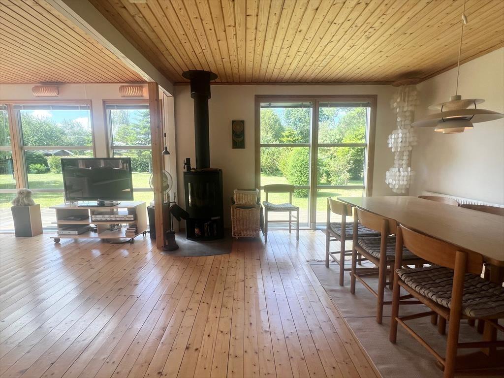 Sommerhuset byder på 3 gode soveværelser med dobbeltseng i det ene soveværelse og 1 enkeltmandsseng i det andet soveværelse og 1 køjeseng i det sidste soveværelse. Derudover er der 1 badeværelse med wc og bruser. Til sidst sommerhusets hjerte, det åbne køkken med udgang til stuen og spisestuen. Herfra er der udsigt til husets skønne have, og udgang til husets terrasse.