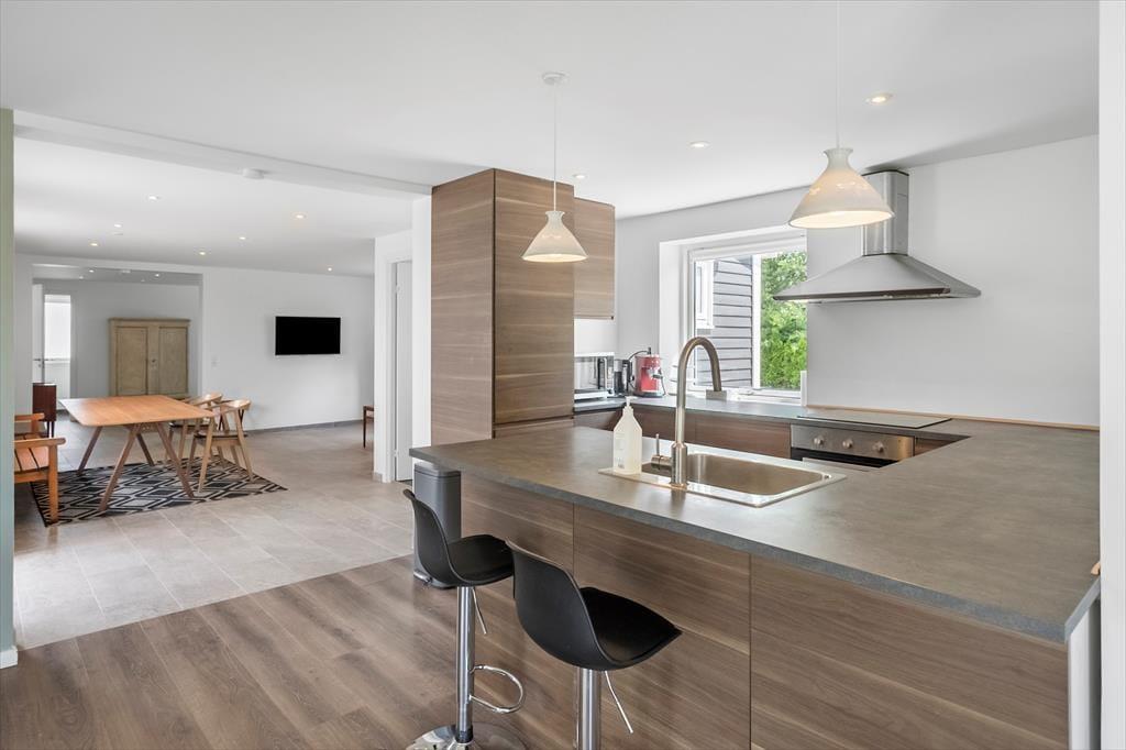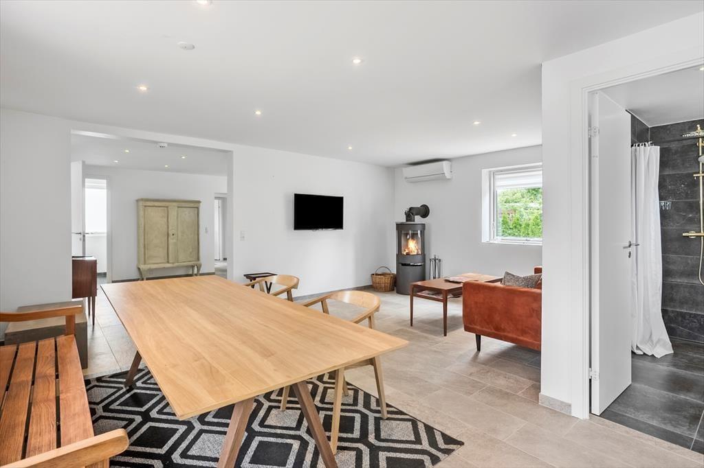 Sommerhusets naturlige samlingspunkt er det lyse og åbne køkken-alrum, som smelter sammen med spiseafdelingen og en indbydende sofaafdeling – herfra er der direkte adgang til den skønne terrasse, hvor mange gode timer kan nydes.