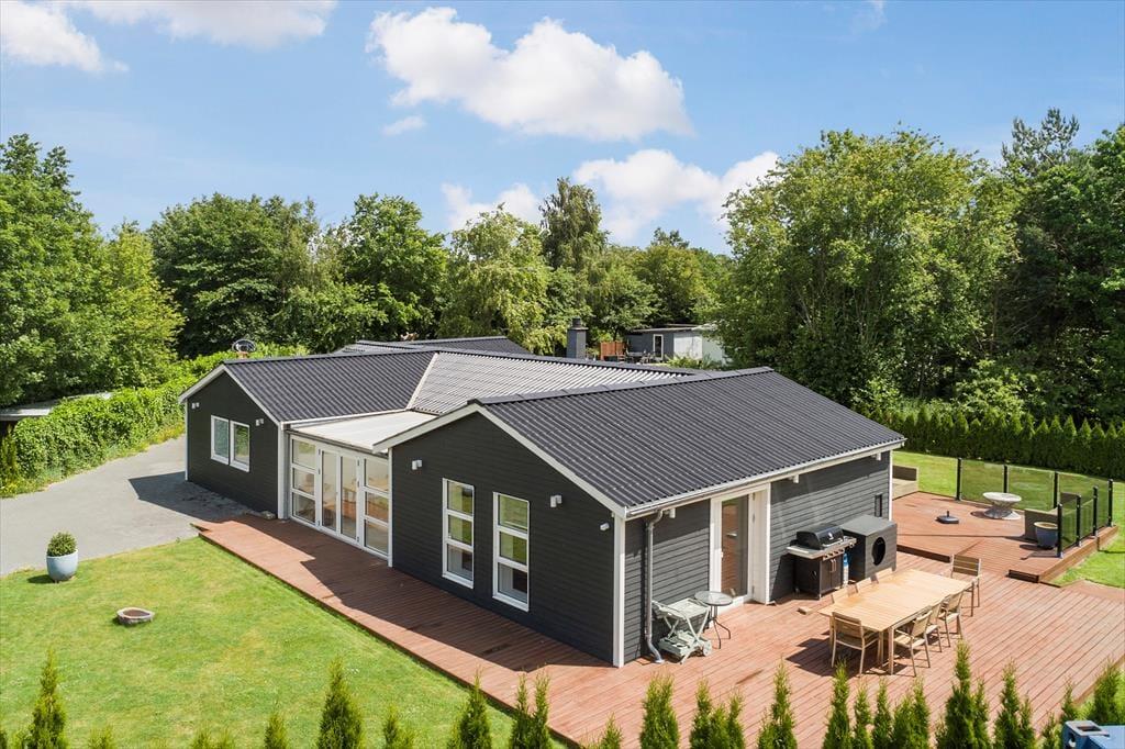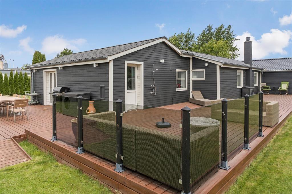Sommerhuset har en stor træterrasse som indbyder til ren afslapning og udeliv med elegante havemøbler, komfortable liggestole og en grill – det perfekte sted til lange sommeraftener. Her finder du også en udendørs bruser, som tilføjer et strejf af spaoplevelse under åben himmel. Grunden byder desuden på en stor, velplejet græsplæne, ideel til leg, spil og hyggelige stunder i det fri.